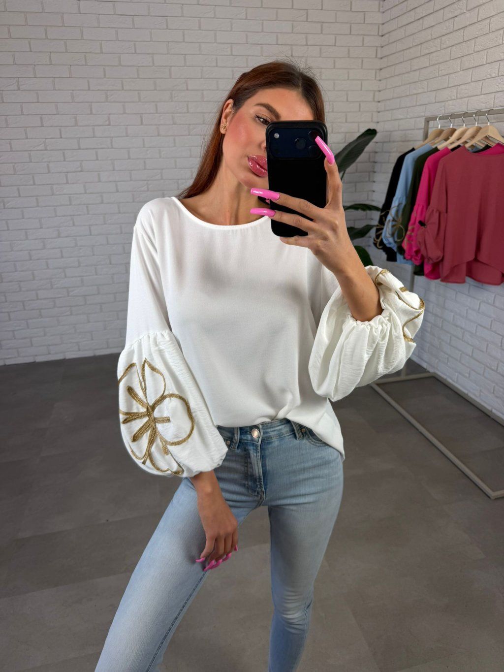 Halenka SUNNY je lehký a pohodlný kousek, který působí jemně a žensky díky nadýchaným rukávům doplněným o decentní květinový detail. Materiál je nemačkavý a příjemný na nošení, takže si zachová upravený vzhled po celý den.
