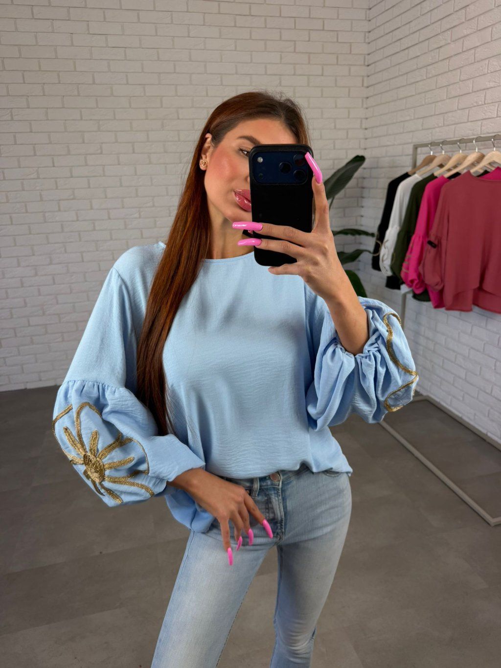 Halenka SUNNY je lehký a pohodlný kousek, který působí jemně a žensky díky nadýchaným rukávům doplněným o decentní květinový detail. Materiál je nemačkavý a příjemný na nošení, takže si zachová upravený vzhled po celý den.