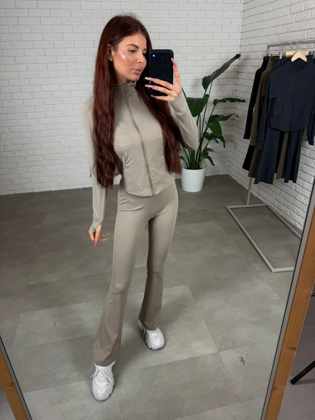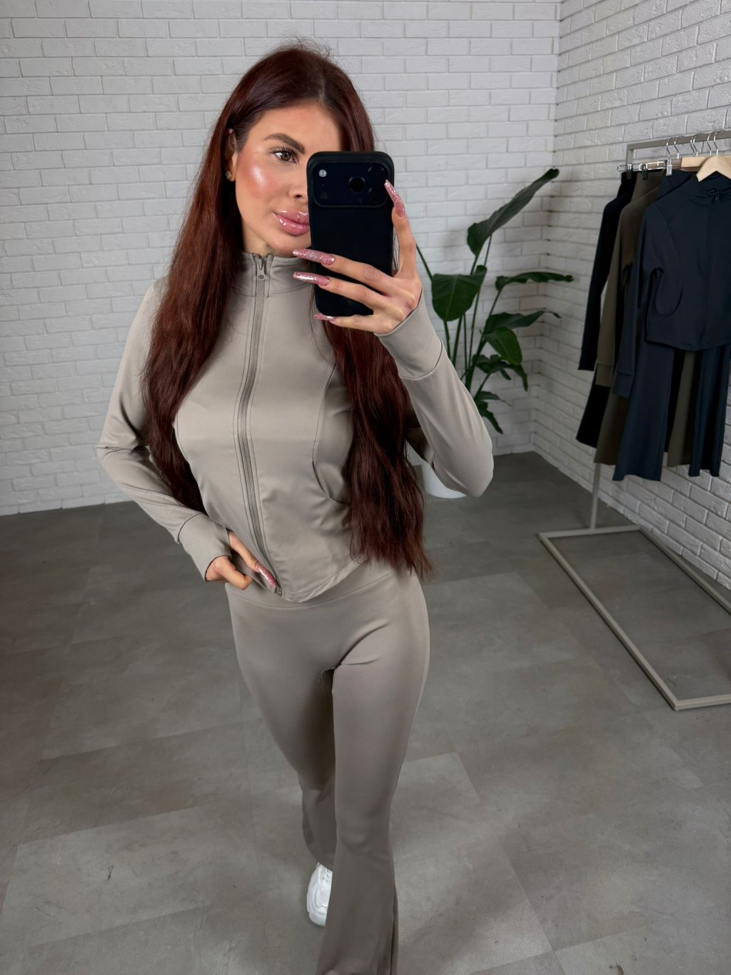 Jógový set NAMBIA je výjimečný kombinací pohodlí, funkčnosti a elegantního designu. Vrchní díl má praktické rukávy s otvorem na palec, které jemně zakrývají část dlaně a zabraňují vyhrnování během pohybu. Po bocích se nacházejí nenápadné kapsy na drobnosti a set je vhodný pro postavy do výšky přibližně 175 cm. Legíny mají elastický pas, který se krásně přizpůsobí postavě a pohodlně sedne i na těhotenské bříško. Spodní část kalhot je zakončena jemně rozšířeným střihem, který působí žensky a opticky prodlužuje nohy. Set je dostupný ve velikostech S/M a L/XL a je ideální pro jógu, relax i běžné nošení.
