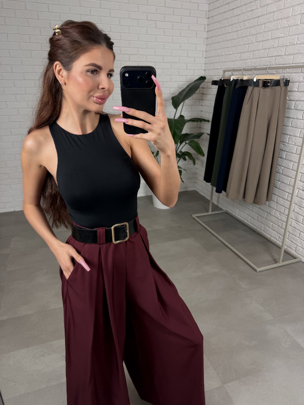 Vysoký pas s volnou elastickou gumou se přizpůsobí postavě a pohodlně sedne i na větší bříško. Součástí kalhot je také pásek, který zvýrazní pas a dodá celému outfitu elegantní detail. Praktickým prvkem jsou také kapsy po bocích.
