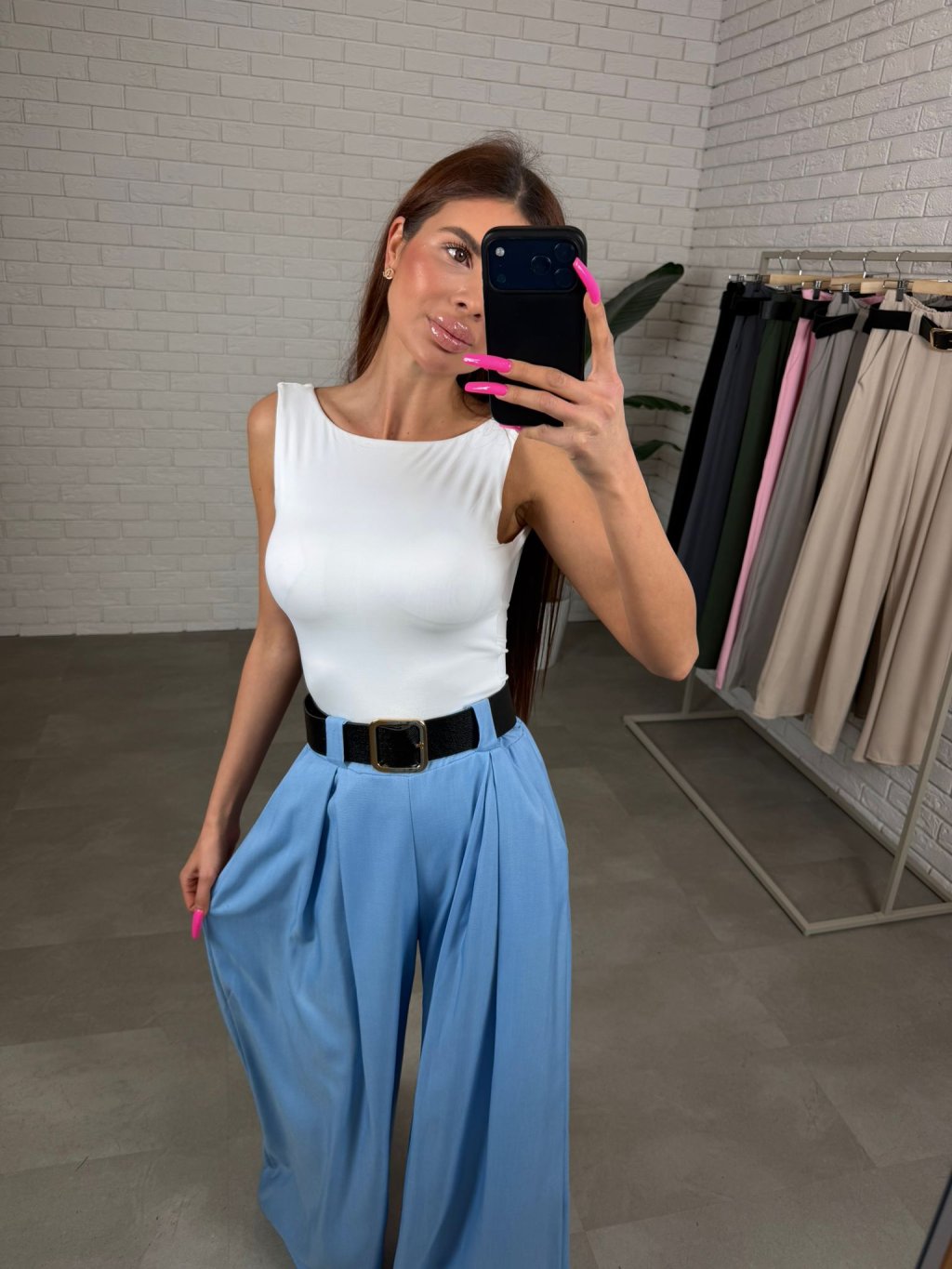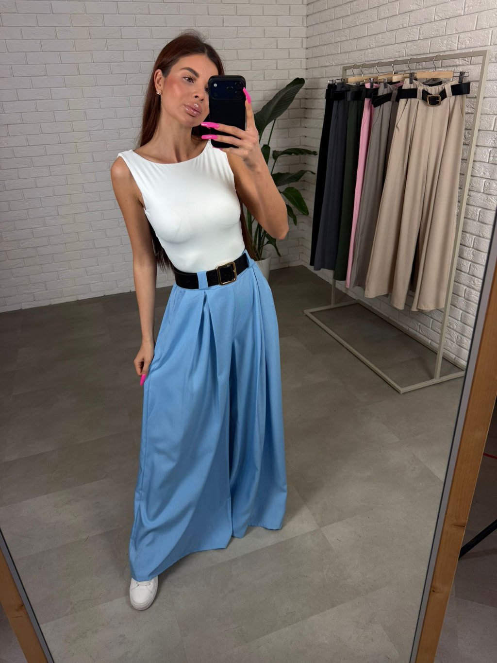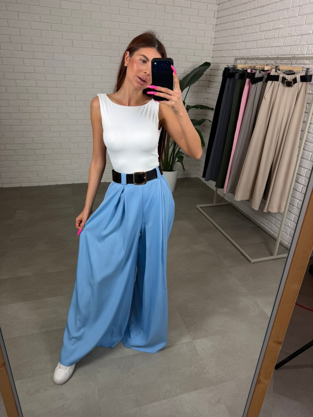 Vysoký pas s volnou elastickou gumou se přizpůsobí postavě a pohodlně sedne i na větší bříško. Součástí kalhot je také pásek, který zvýrazní pas a dodá celému outfitu elegantní detail. Praktickým prvkem jsou také kapsy po bocích.