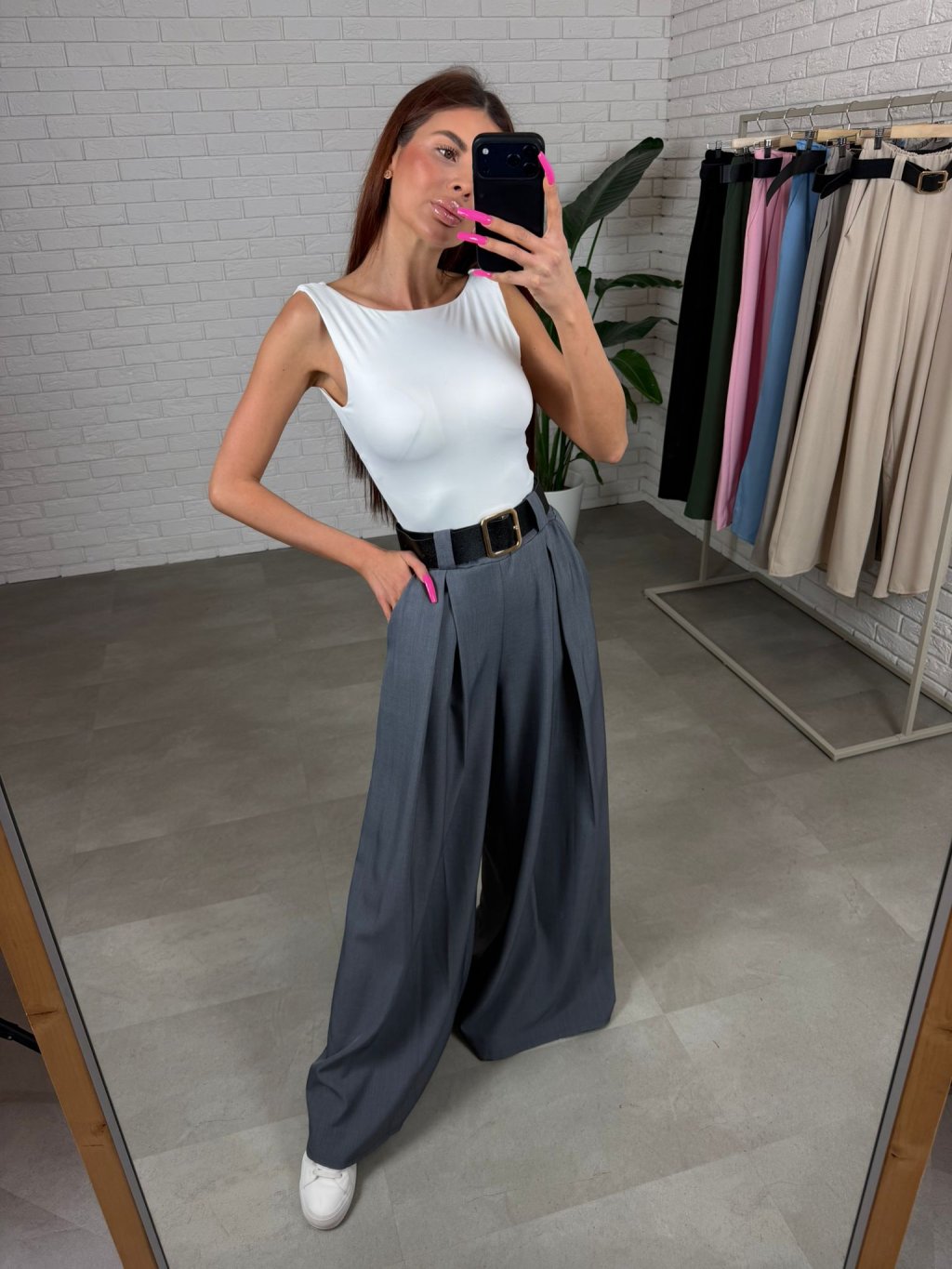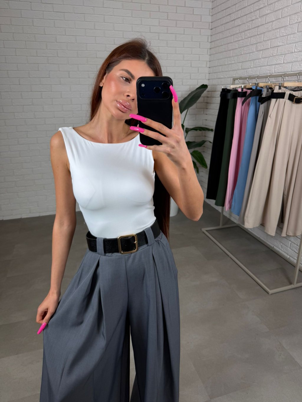 Vysoký pas s volnou elastickou gumou se přizpůsobí postavě a pohodlně sedne i na větší bříško. Součástí kalhot je také pásek, který zvýrazní pas a dodá celému outfitu elegantní detail. Praktickým prvkem jsou také kapsy po bocích.
