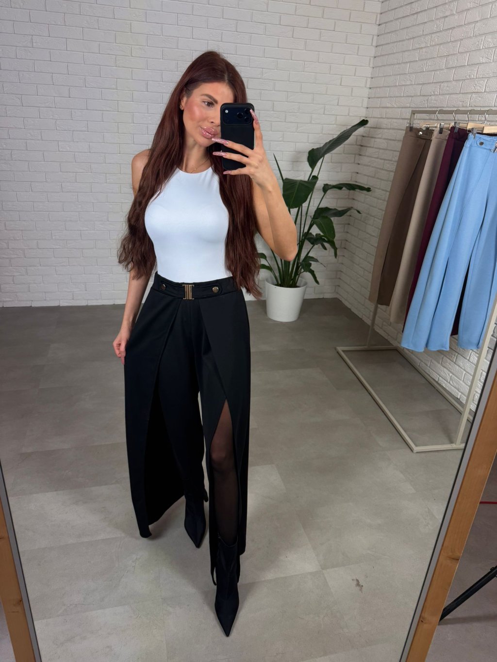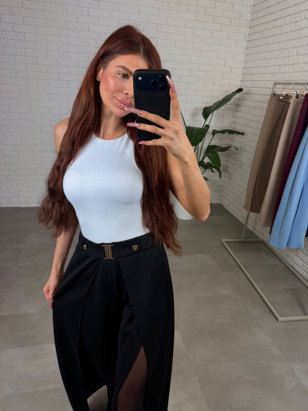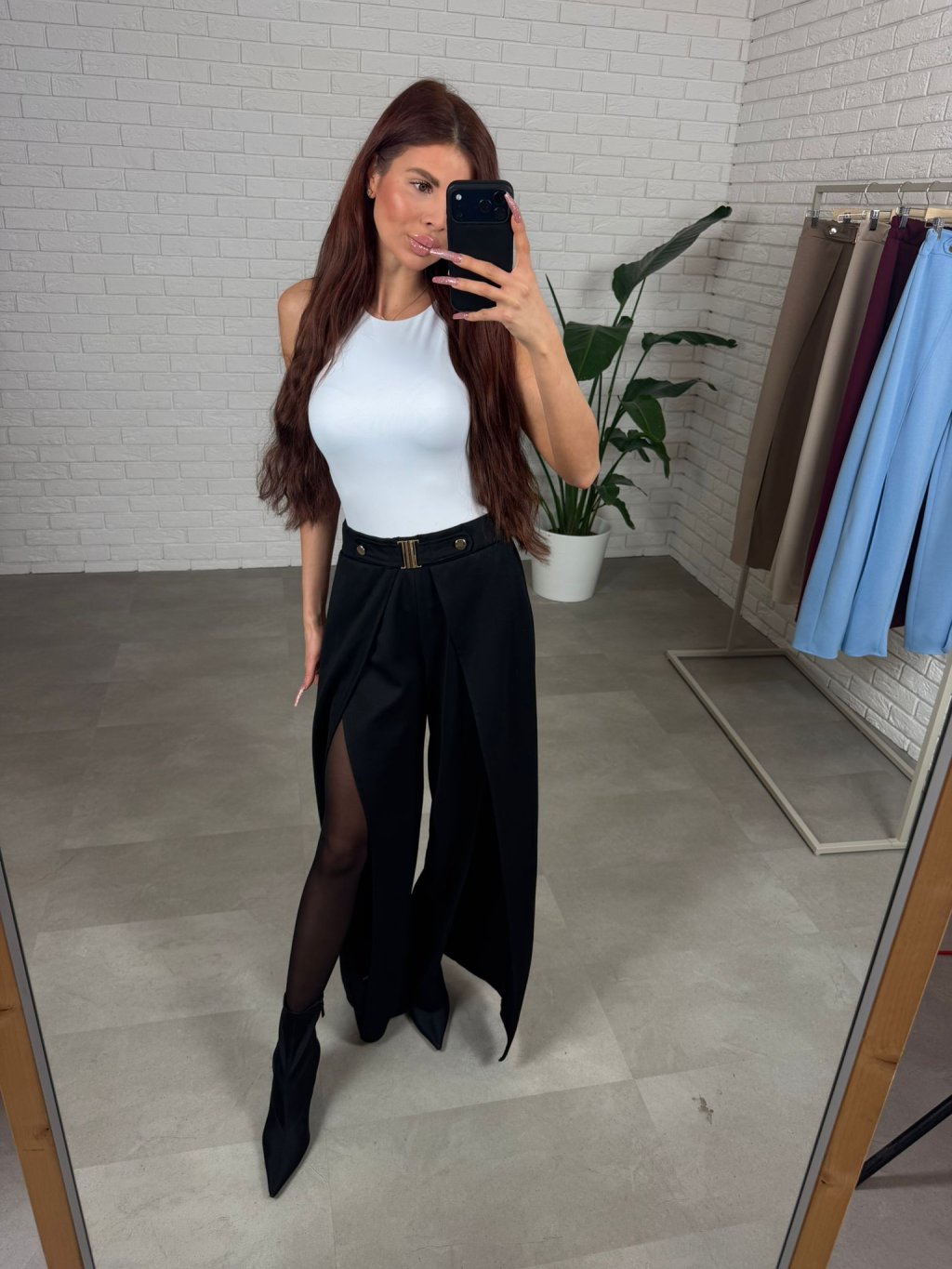 Kalhoty DARA s otevřeným střihem, stylový kousek z hladkého poloteplákového nemačkavého materiálu. Na vysokém pase je elastická guma se zlatými elementy. Sednou od XS po L Na vyšší i nižší dívky. Kalhoty DARA jsou skvělá volba na jaře i na léto.