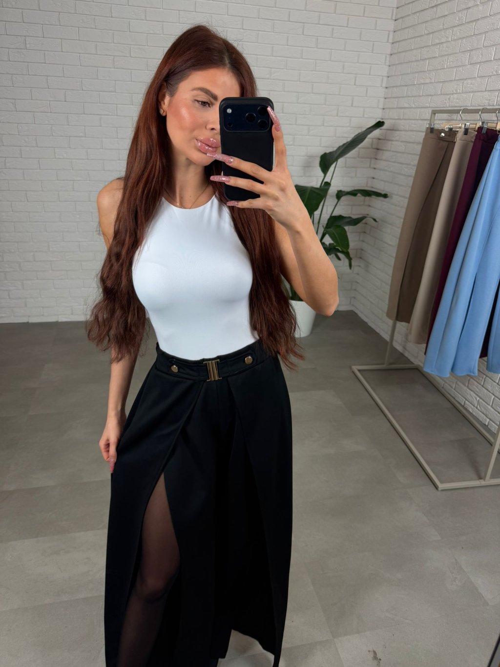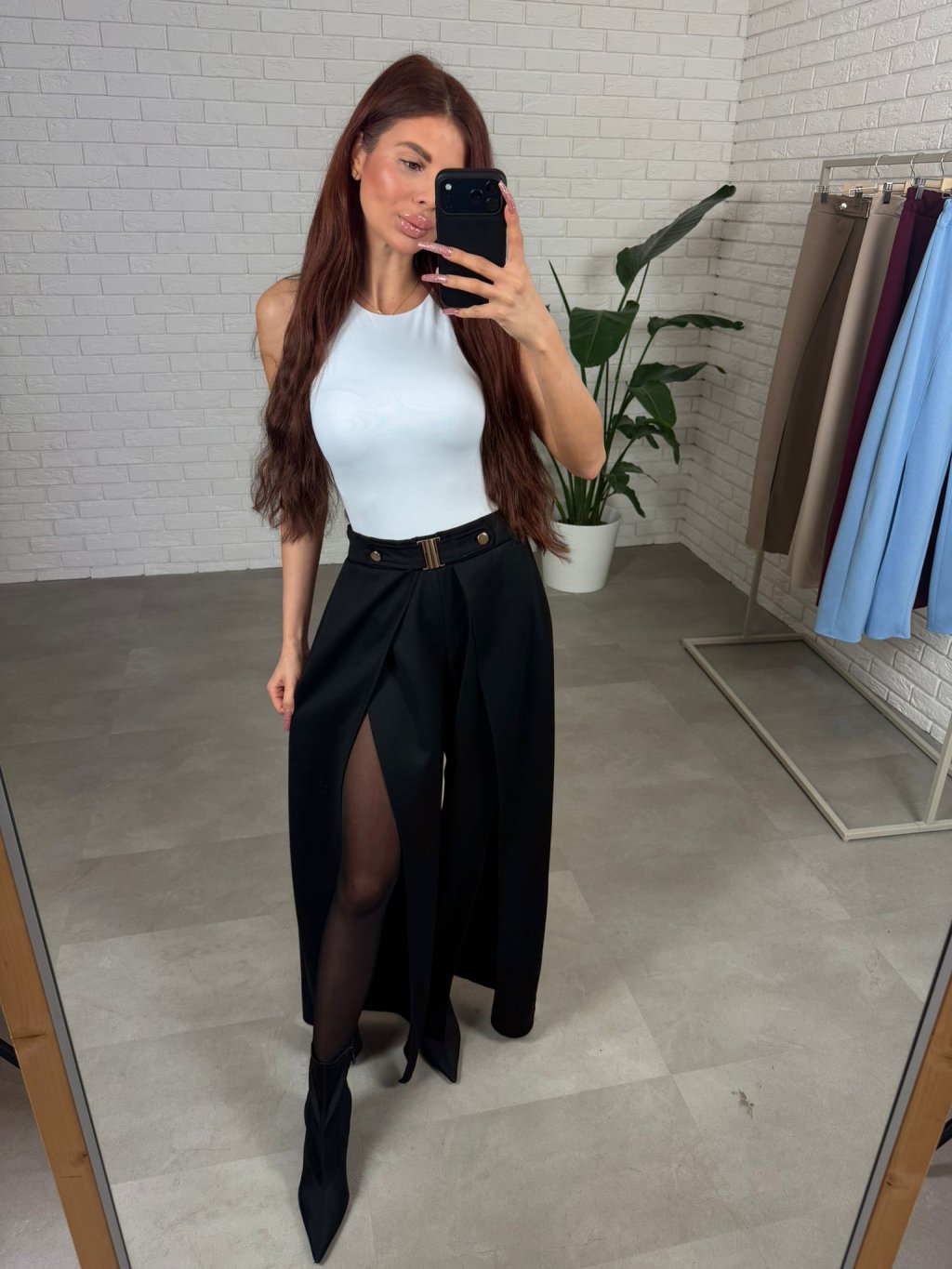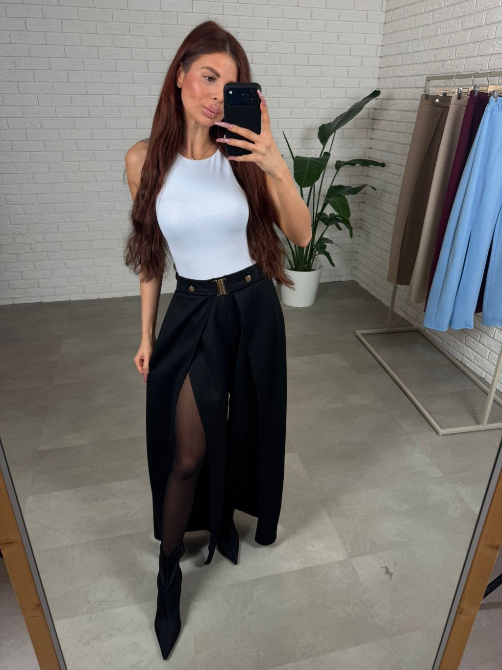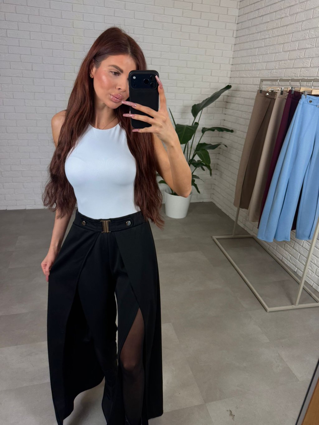 Kalhoty DARA s otevřeným střihem, stylový kousek z hladkého poloteplákového nemačkavého materiálu. Na vysokém pase je elastická guma se zlatými elementy. Sednou od XS po L Na vyšší i nižší dívky. Kalhoty DARA jsou skvělá volba na jaře i na léto.