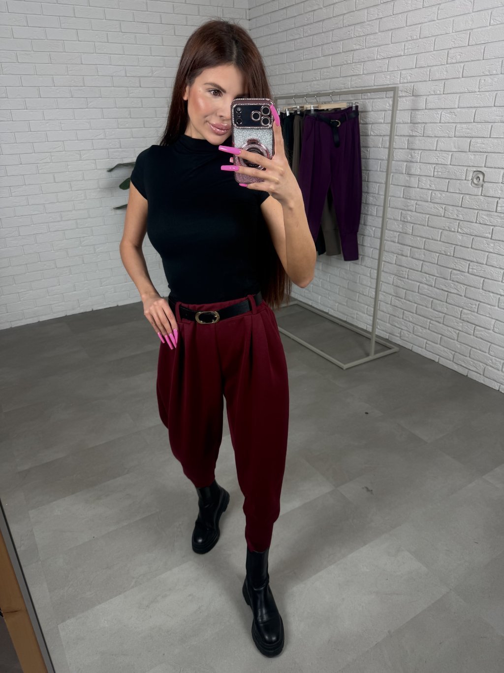 Kalhoty DAVONA díky pudlovému střihu ideálně maskují oblast zadečku, stehen a boků. Vyrobeny jsou z našeho bestsellerového poloteplákového materiálu, ve kterém se budeš cítit pohodlně v práci, ale také na kávičce. Po bocích mají praktické hluboké kapsy. Mají vysoký pas, který lemuje opasek černé barvy se zlatou přezkou. Na spodu jsou zúžené, díky čemuž se dobře kombinují s holínkami. Sednou na konfekční velikost od XS po XL, na kočky vysoké maximálně 175 cm.