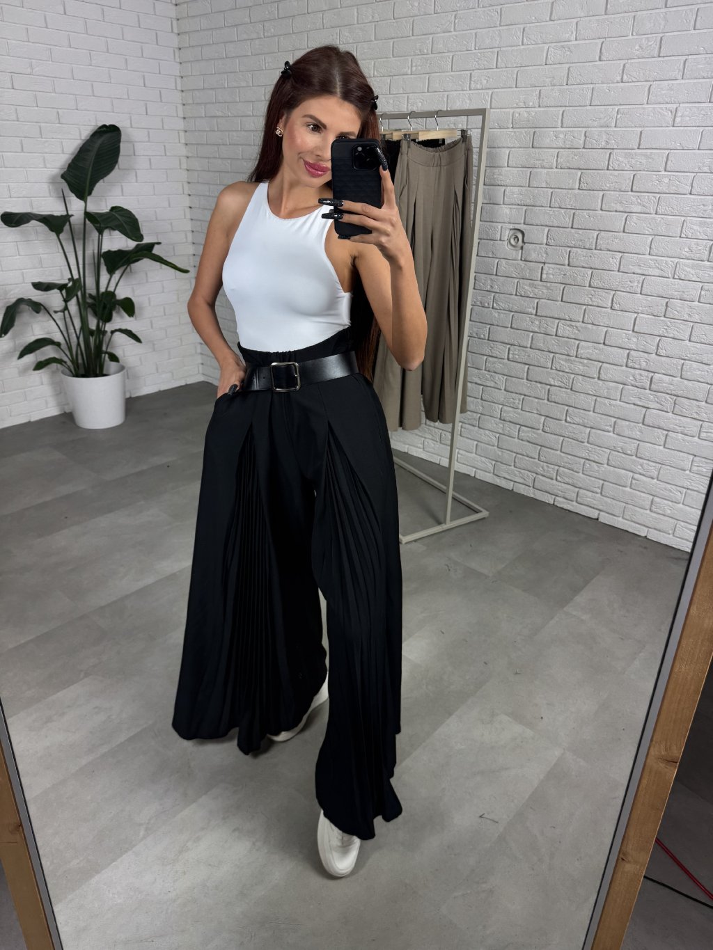 Kalhoty EMERAL jsou bohaté na materiál a nemačkavé. Vpředu mají překládaný plisovaný detail. V pase mají elastickou gumku. Sednou od většího S po XL. Vhodné pro vyšší postavy do 180cm. Po bocích mají kapsy. Opasek je ilustrační.