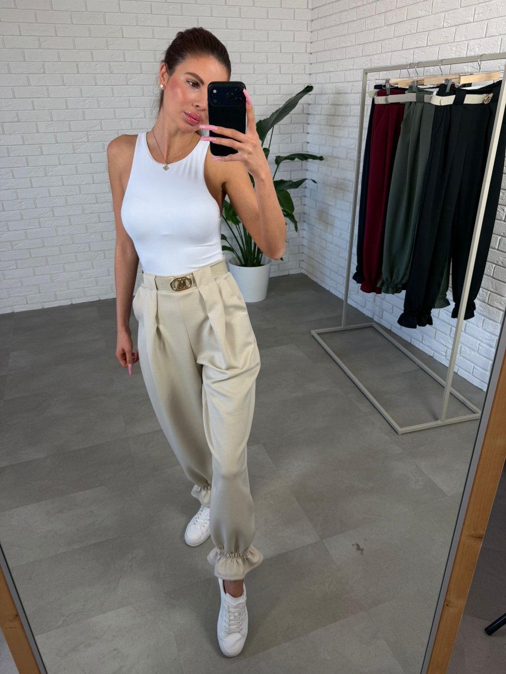 Kalhoty jsou navrženy tak, aby poskytly maximální pohodlí a zároveň vytvořily krásně vyváženou siluetu. Vyrobeny jsou z oblíbeného poloteplákového materiálu, který je měkký, příjemný na dotek a ideální pro každodenní nošení. Elastický pas se dokonale přizpůsobí postavě bez nepříjemného tlačení a zajistí komfort po celý den. Volnější ležérní střih elegantně splývá na postavě a pomáhá zakrýt oblast pasu, boků i zadečku. Spodní část kalhot je zakončena gumičkovým patentem s jemně nařaseným volánkem, který dodává kalhotám moderní a stylový vzhled. Kalhoty jsou ideální pro běžné nošení, do práce i pro volný čas. Výškově jsou vhodné pro postavy do 175 cm a velikostně sednou od S po XL.