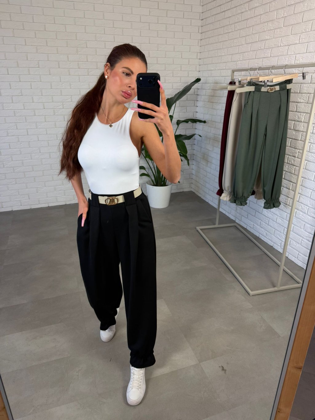 Kalhoty jsou navrženy tak, aby poskytly maximální pohodlí a zároveň vytvořily krásně vyváženou siluetu. Vyrobeny jsou z oblíbeného poloteplákového materiálu, který je měkký, příjemný na dotek a ideální pro každodenní nošení. Elastický pas se dokonale přizpůsobí postavě bez nepříjemného tlačení a zajistí komfort po celý den. Volnější ležérní střih elegantně splývá na postavě a pomáhá zakrýt oblast pasu, boků i zadečku. Spodní část kalhot je zakončena gumičkovým patentem s jemně nařaseným volánkem, který dodává kalhotám moderní a stylový vzhled. Kalhoty jsou ideální pro běžné nošení, do práce i pro volný čas. Výškově jsou vhodné pro postavy do 175 cm a velikostně sednou od S po XL.