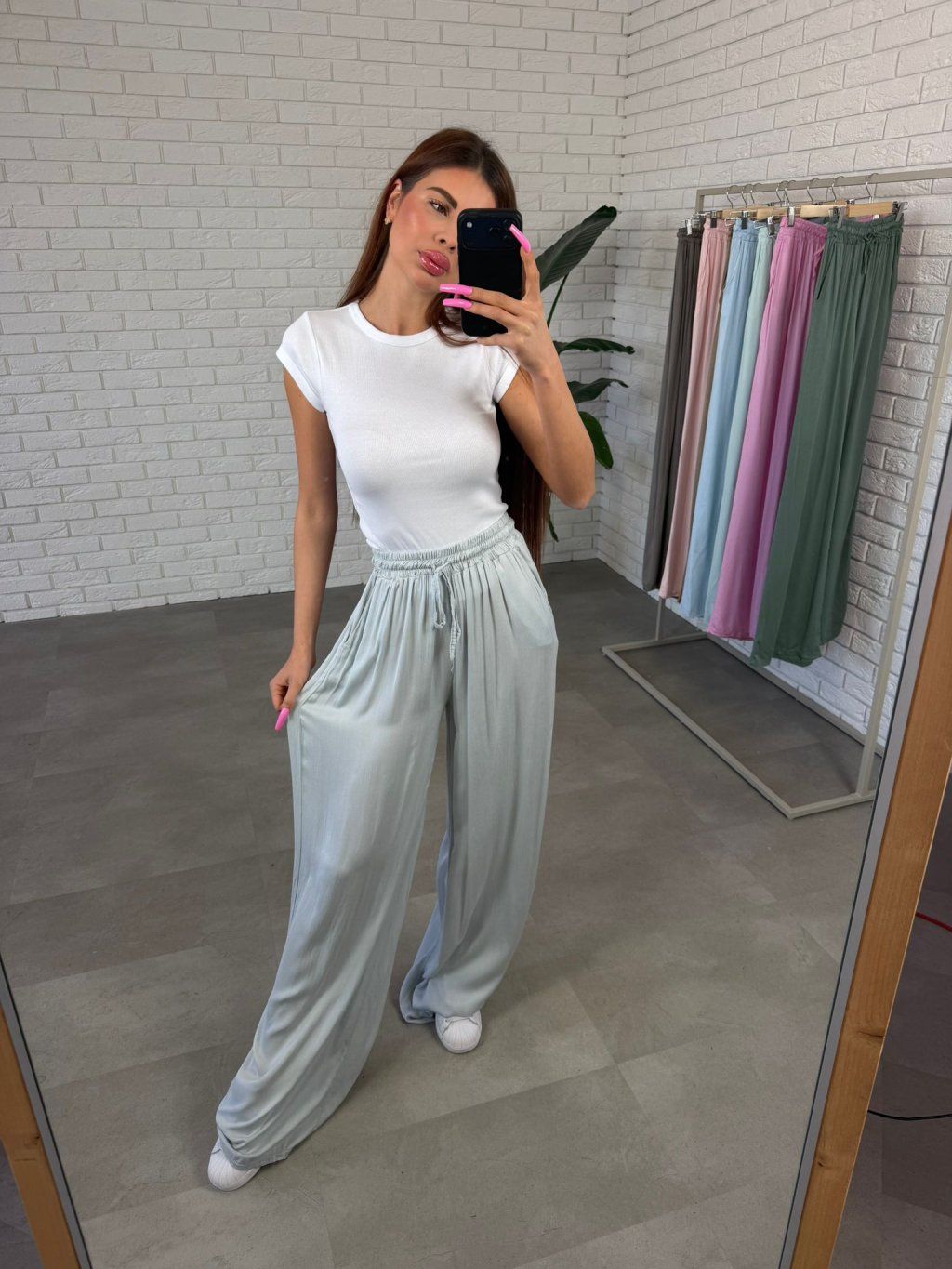 Materiál je jeden z našich nejoblíbenějších – lehký, vzdušný a velmi příjemný na dotek, ideální zejména pro teplejší dny. V pase se nachází elastická guma spolu se šňůrkou, díky čemuž se kalhoty přizpůsobí každé postavě – sednou na různé typy pasu i boků bez pocitu stažení.
