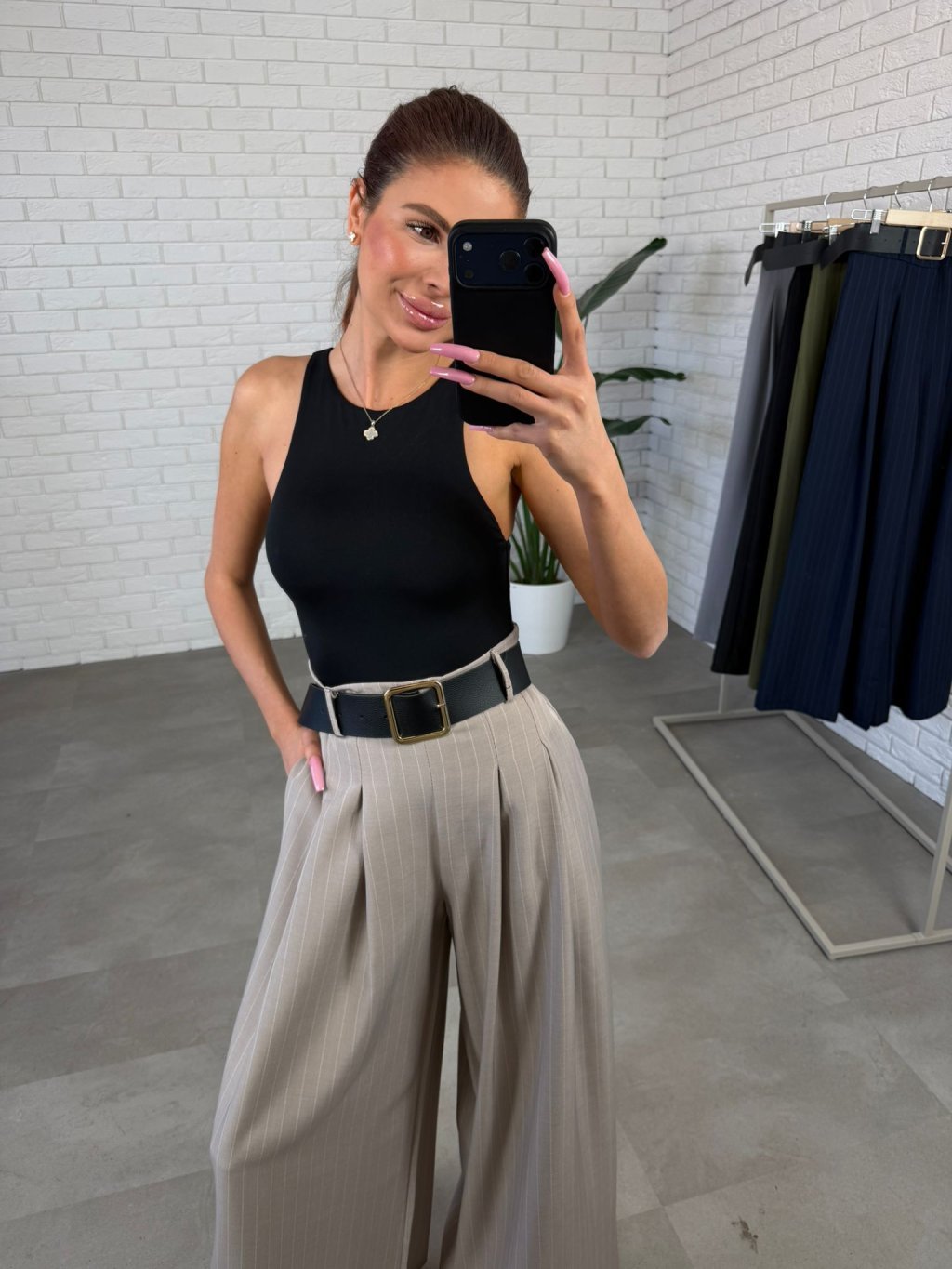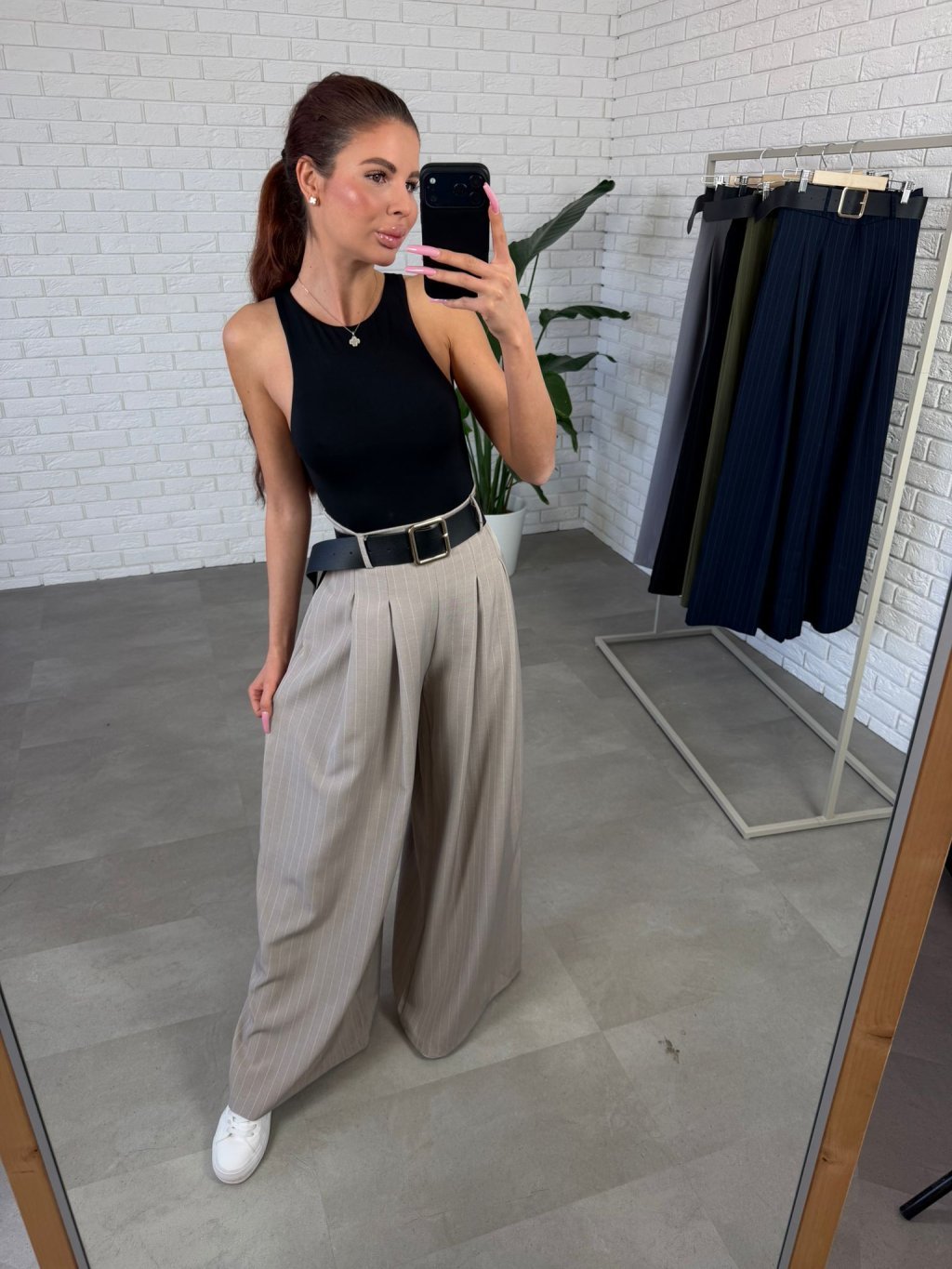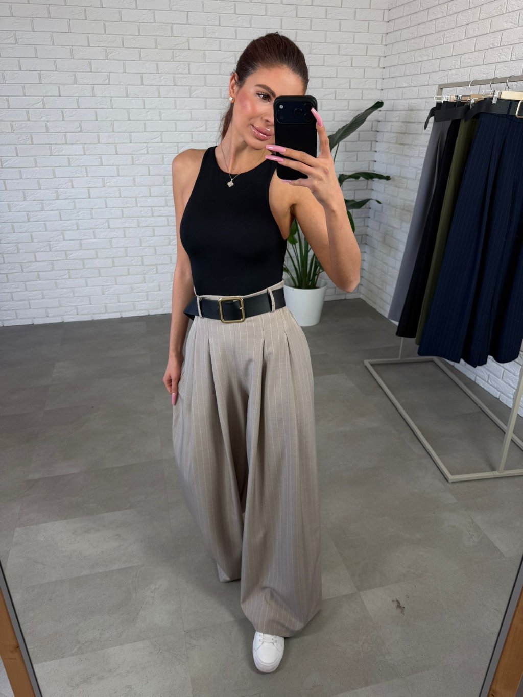 Kalhoty NORIO jsou ušity v ležérním, volnějším střihu, který krásně sedne i na větší křivky a zároveň jemně zamaskuje případné nedokonalosti v oblasti boků či stehen. Pohodlný elastický pas se přizpůsobí postavě, aniž by ses cítili stísněně. Součástí je také opasek, který zvýrazní siluetu. Páskavý vzor opticky zeštíhluje a přední skládání dodává kalhotám elegantnější dojem, díky kterému je bez problémů využiješ i na dny, kdy chceš působit upraveněji. Praktické boční kapsy jsou detail, který oceníš při každodenním nošení. Výškově jsou vhodné do 180 cm a velikostně sedí na konfekční velikosti od S po XL.