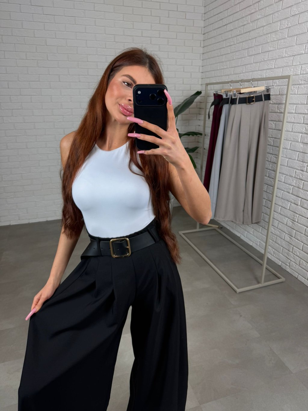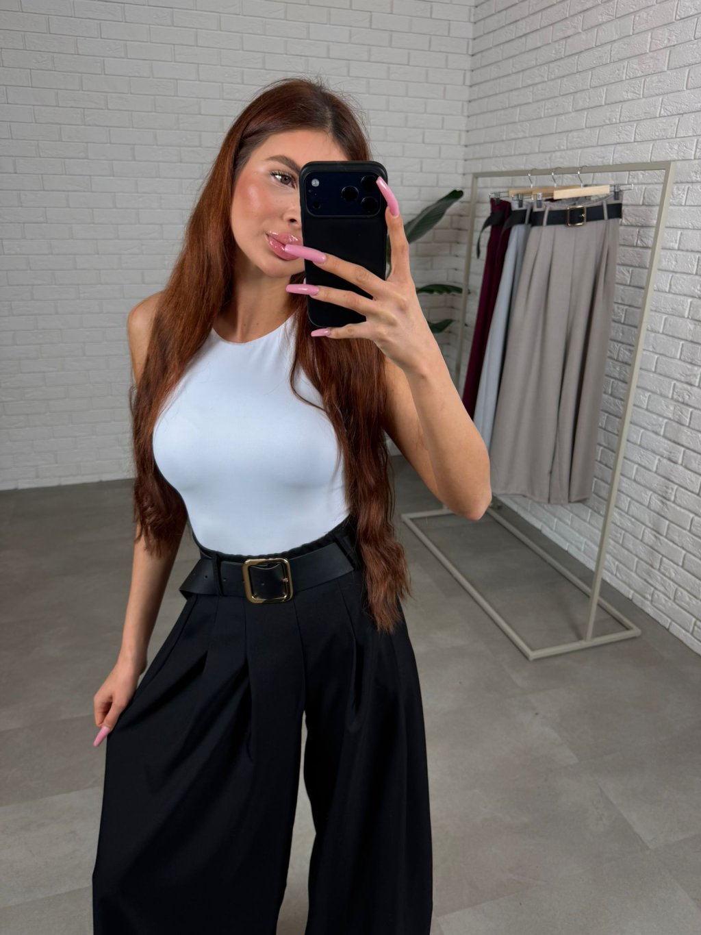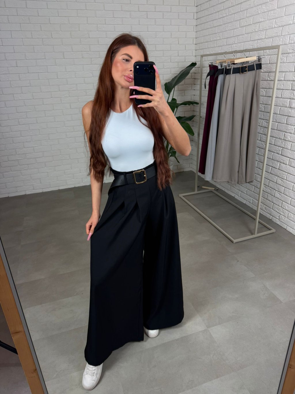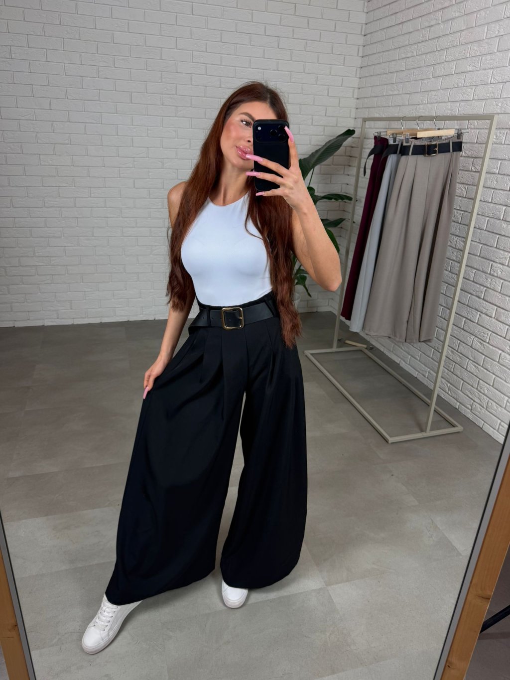 Vysoký pas krásně zvýrazní siluetu a spolu s páskem vytvoří pěknou linii v pase. Střih je volný a ležérní, takže kalhoty přirozeně splývají na postavě a zakryjí případné nedokonalosti v oblasti bříška, boků nebo hýždí. Právě proto jsou velmi oblíbené také mezi kočkami, které mají výraznější ženské křivky. Kalhoty jsou navrženy tak, aby pohodlně sedly i ženám s větším zadkem nebo boky, přičemž stále působí elegantně a žensky. Délkou jsou vhodné pro ženy do výšky přibližně 180 cm a velikostně sednou od S po XL.