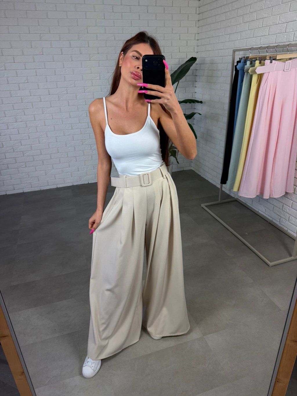 Volný střih přirozeně splývá na postavě a pomáhá zjemnit oblast bříška, boků i zadečku, díky čemuž jsou kalhoty vhodné zejména pro postavy typu hruška a jablko. Zároveň ale působí elegantně a žensky bez zbytečného objemu.