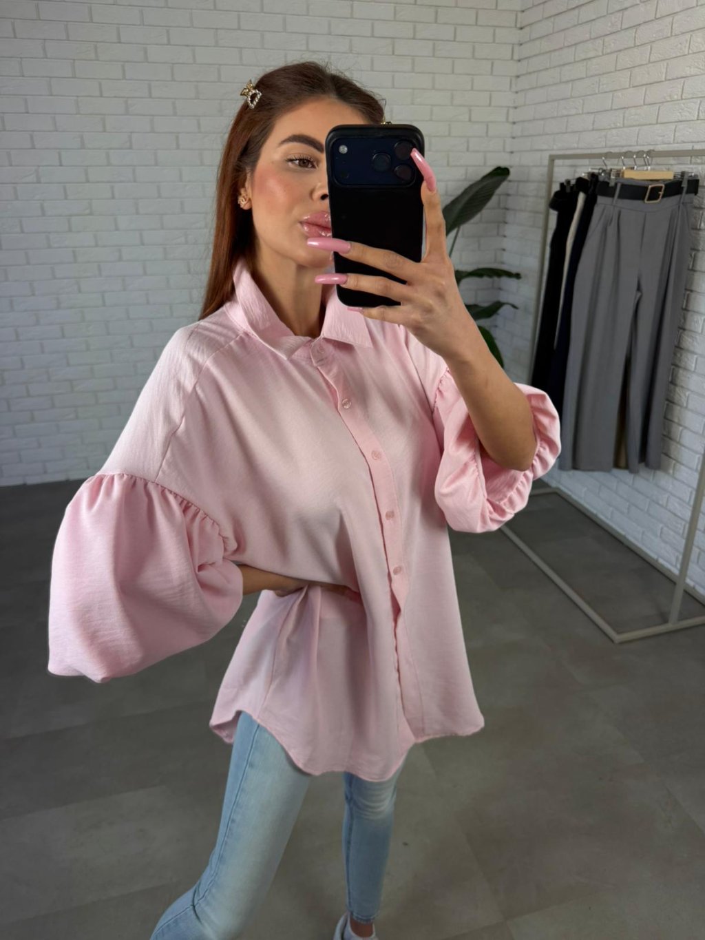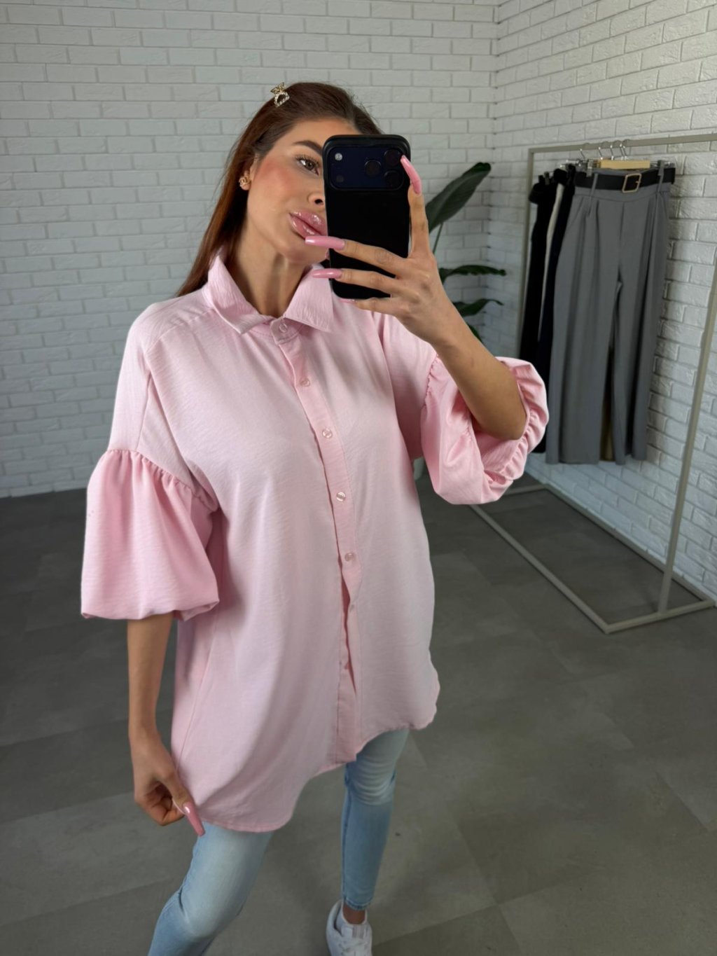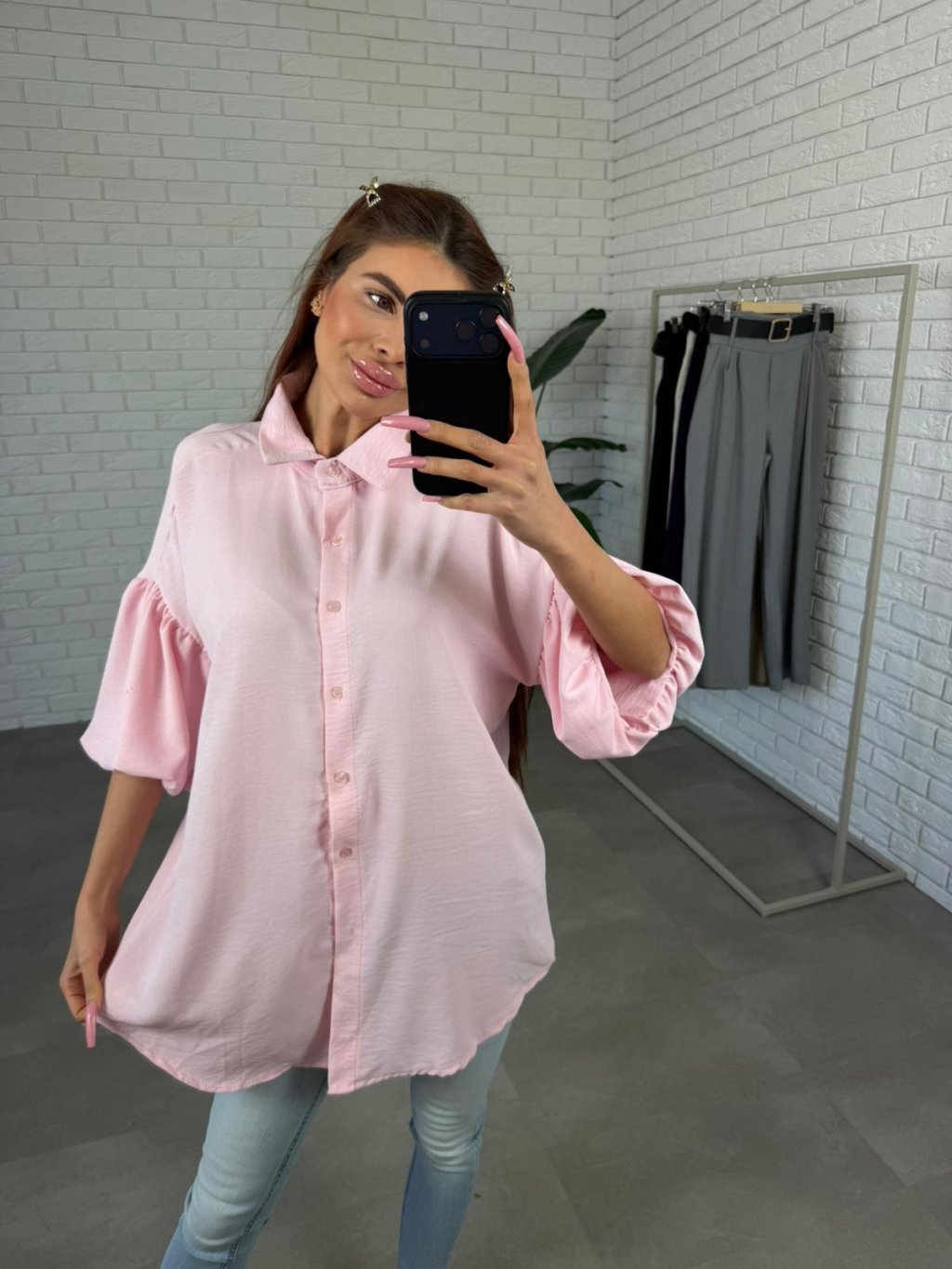 Materiál je příjemný na dotek, vzdušný a nemačkavý, díky čemuž si košile drží pěkný vzhled i během celého dne. Rukávy jsou rozšířeny balonové a končí po loktech, což vytváří zajímavý ženský detail.