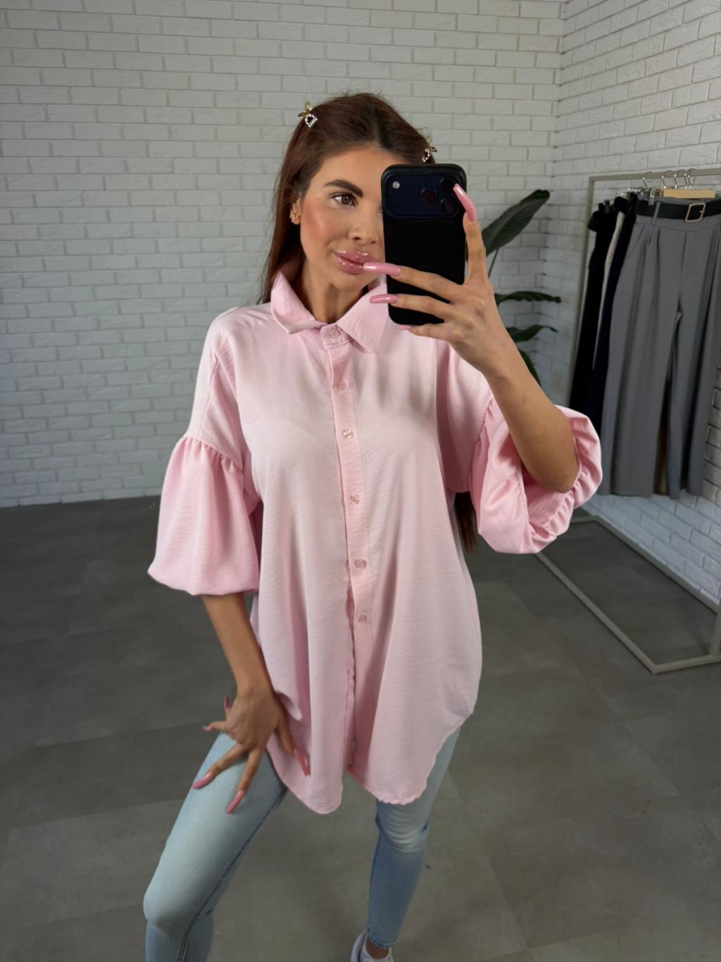 Prodloužený střih vzadu je velmi praktický a lichotí postavě. Košili můžeš nosit volně spuštěnou nebo ji elegantně zapravit do kalhot či sukně podle toho, jaký styl chceš vytvořit.