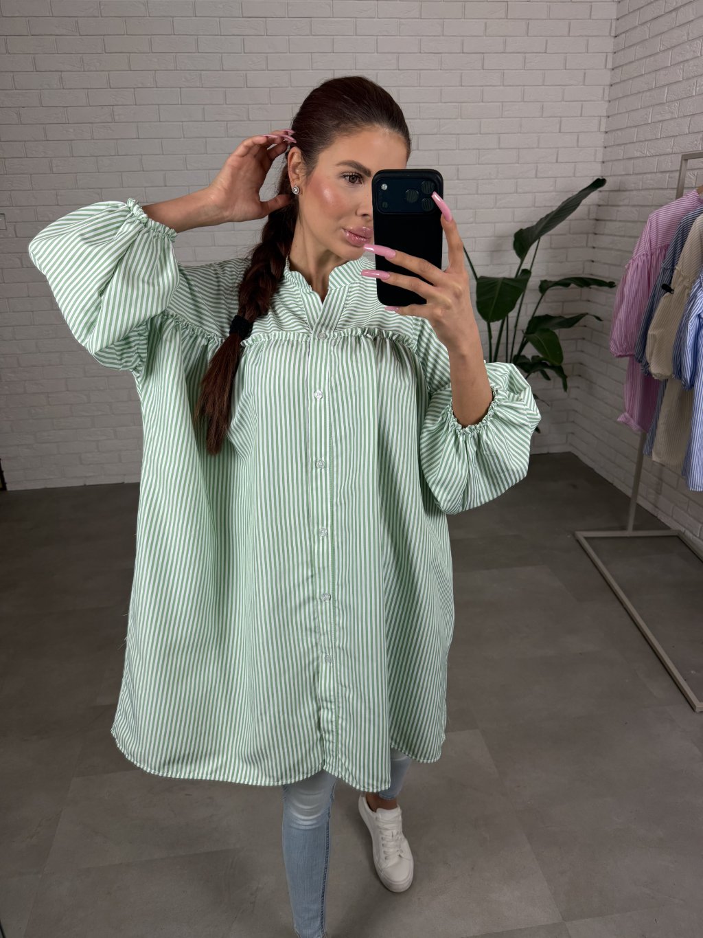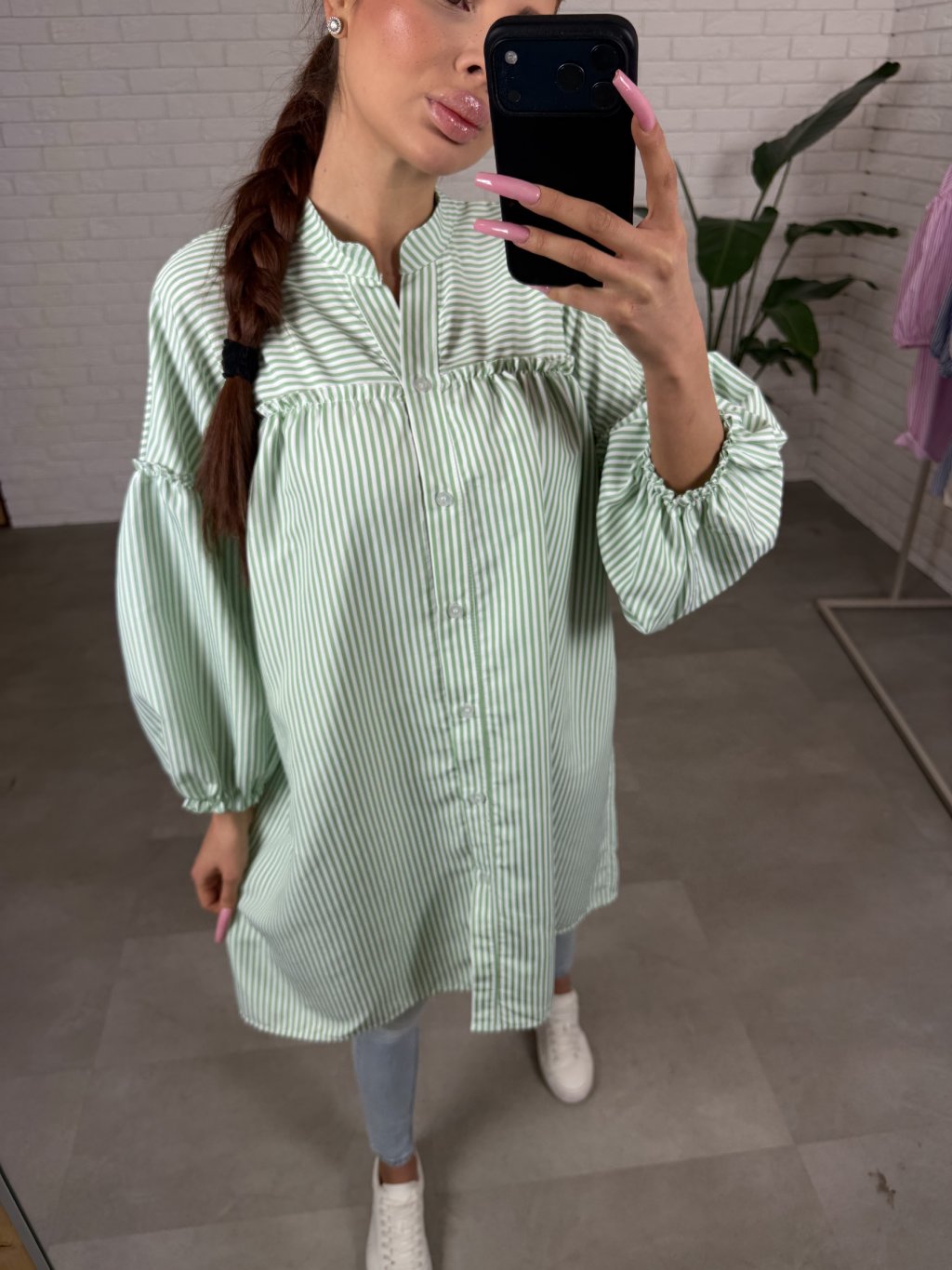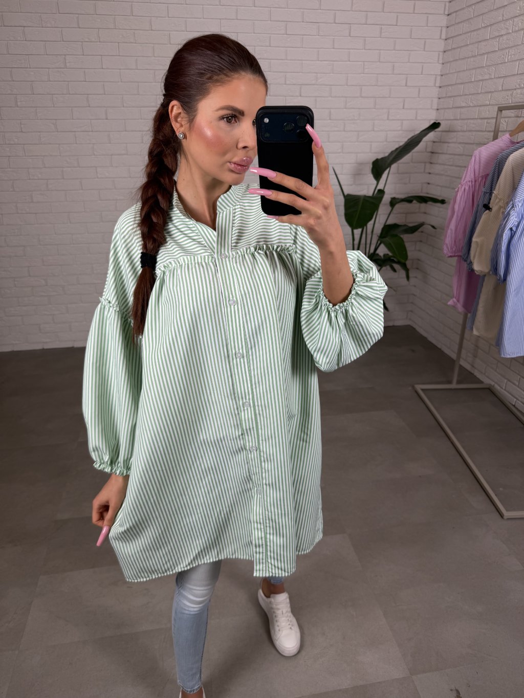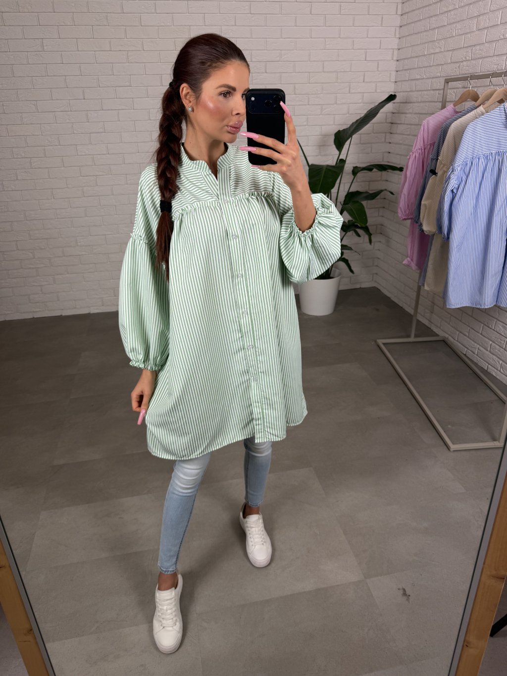 Svislé pruhy opticky zeštíhlují a prodlužují siluetu, díky čemuž působí outfit upraveně a žensky bez námahy. Rukávy jsou výrazně volné a zakončené jemnou elastickou gumičkou, která vytváří pěkný objem a zároveň zajistí pohodlí při nošení. Díky své délce je košile ideální nejen ke legínám nebo džínám, ale můžeš ji nosit i samostatně jako lehké letní šaty. Velikostně sedne na konfekční velikosti M až XL.