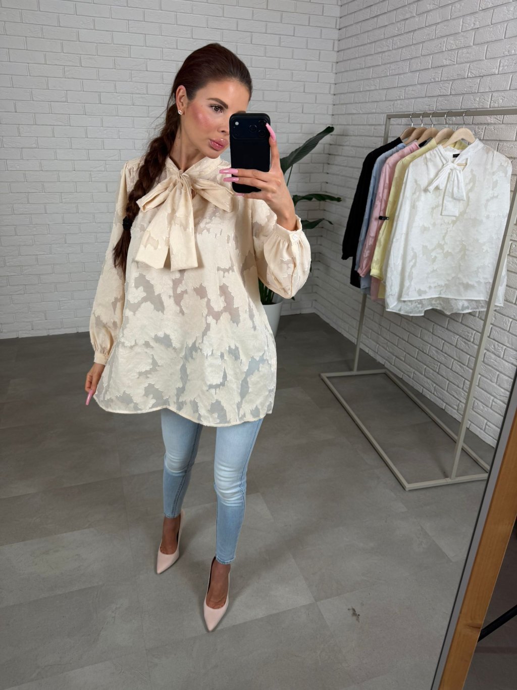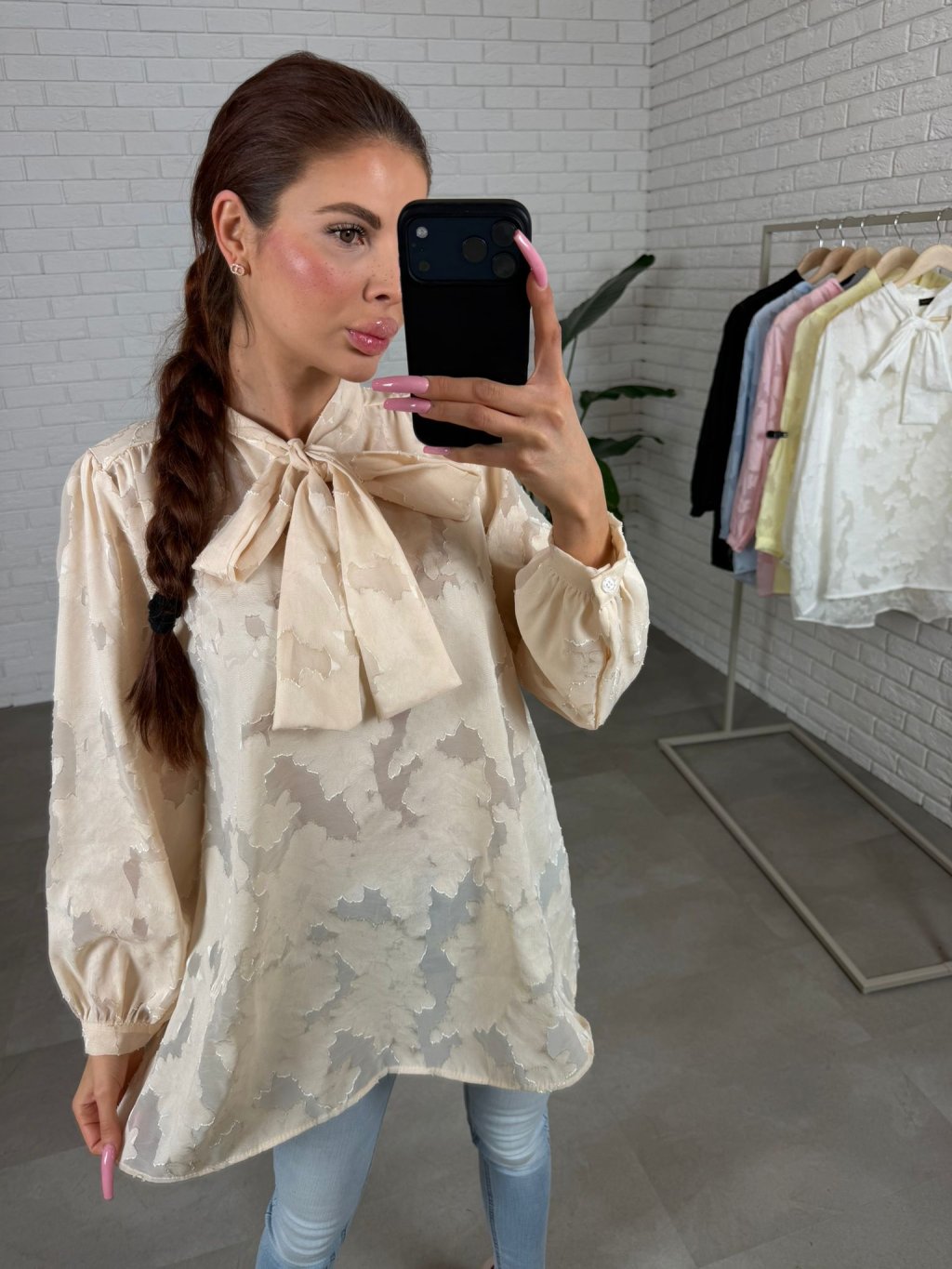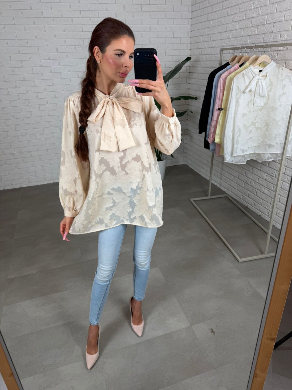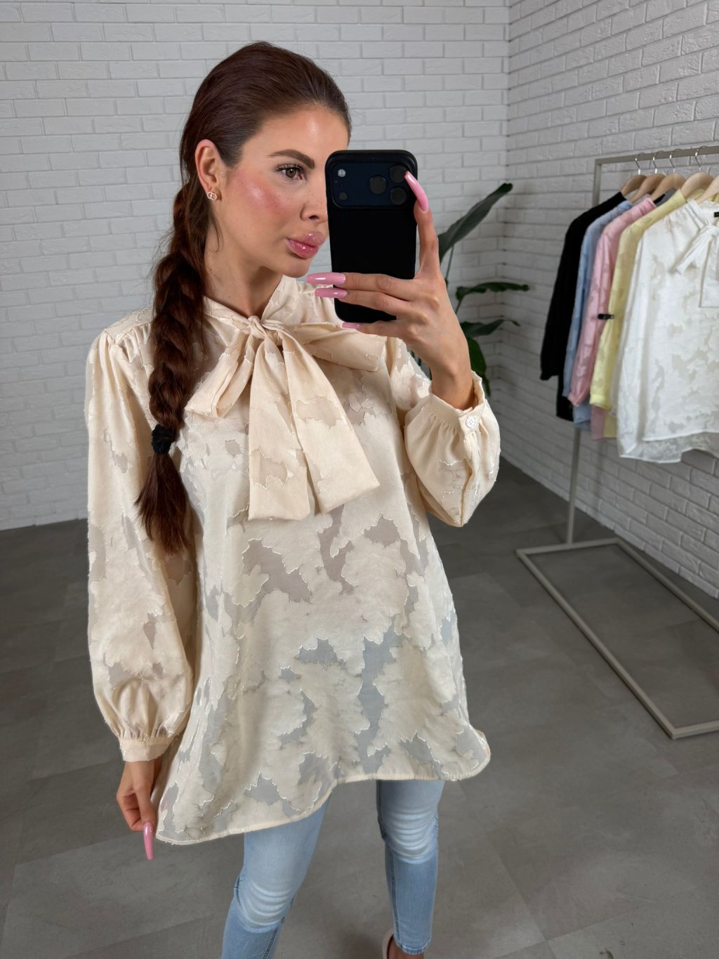 Dominantou je výrazná mašlička u krku, která působí romanticky a žensky, zatímco jemné knoflíčky na rukávech podtrhují celkový sofistikovaný vzhled. Prodloužený střih zajišťuje pohodlí a variabilitu stylingu. Halenku můžeš nosit volně spuštěnou pro ležérní elegantní efekt nebo ji zakasat do kalhot či sukně a zvýraznit tak pas.
