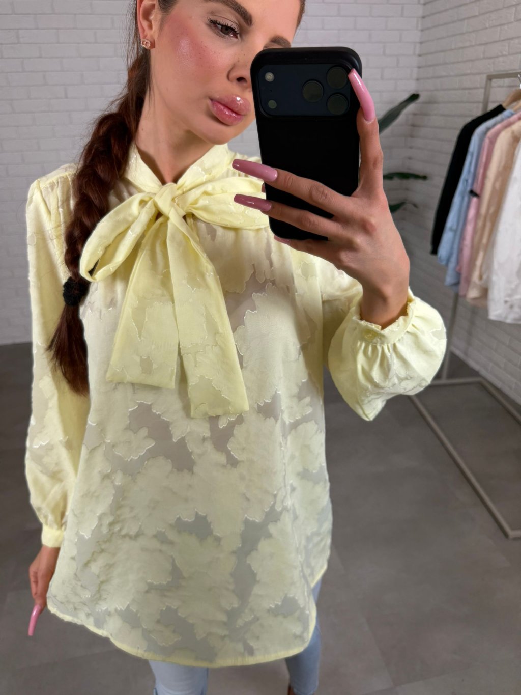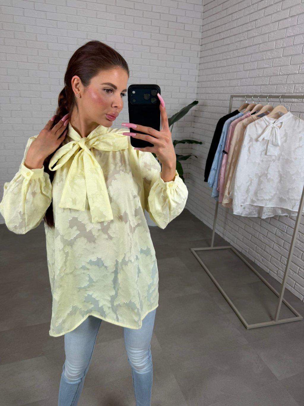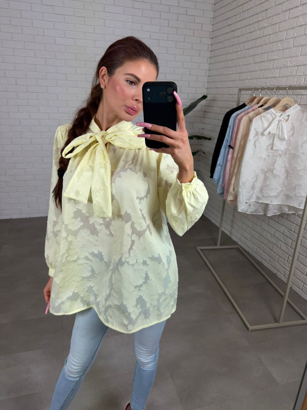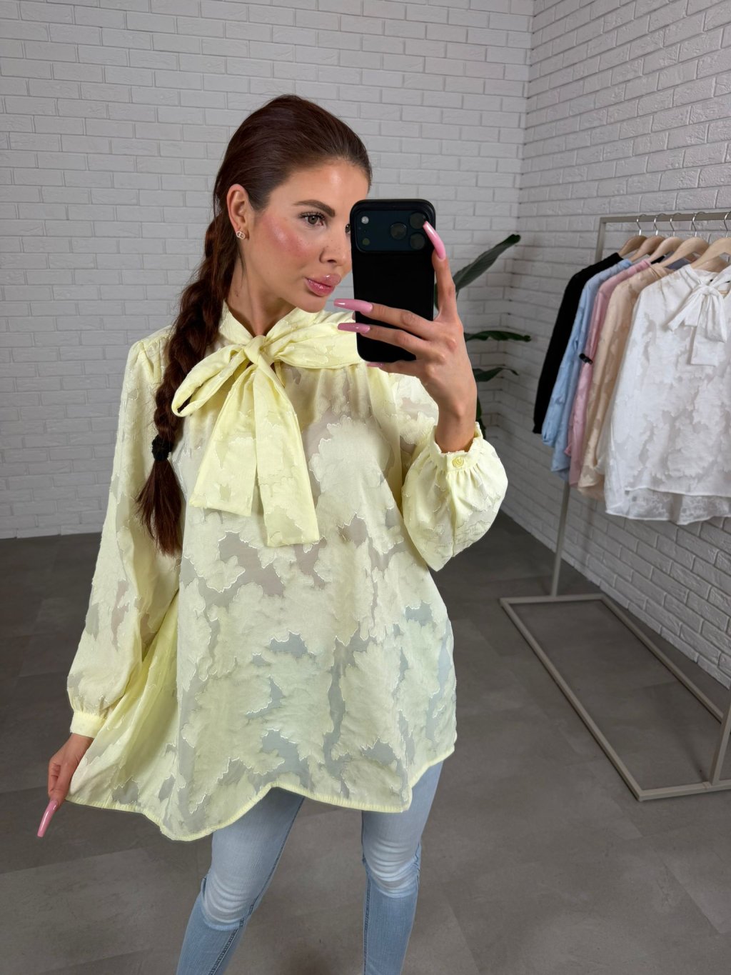 Dominantou je výrazná mašlička u krku, která působí romanticky a žensky, zatímco jemné knoflíčky na rukávech podtrhují celkový sofistikovaný vzhled. Prodloužený střih zajišťuje pohodlí a variabilitu stylingu. Halenku můžeš nosit volně spuštěnou pro ležérní elegantní efekt nebo ji zakasat do kalhot či sukně a zvýraznit tak pas.
