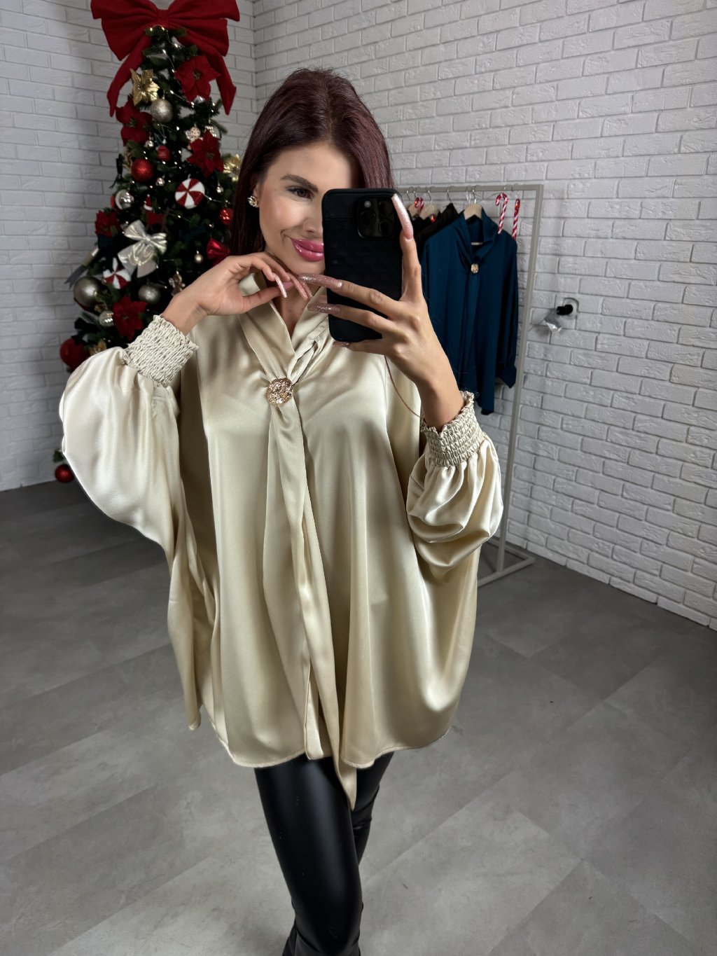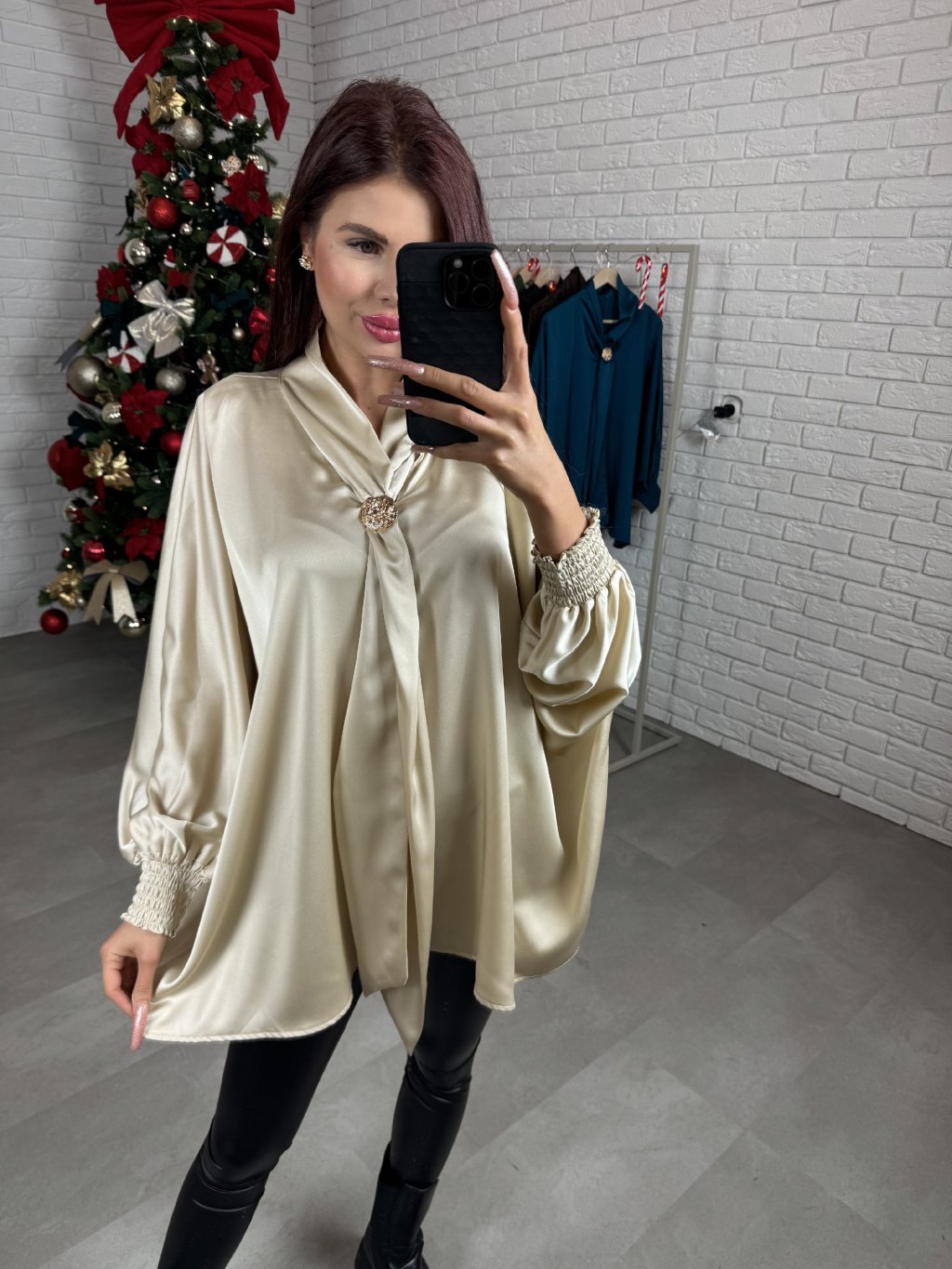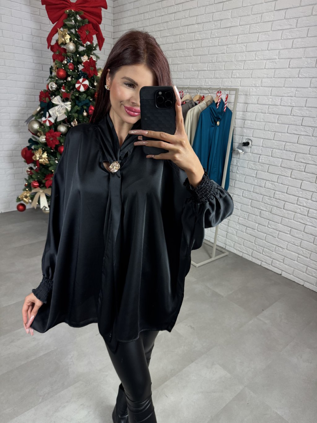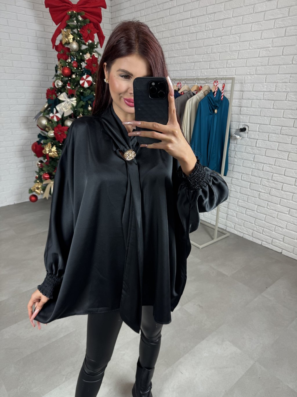 Košile LATORA na první pohled okouzlí nejen padavým a elegantním materiálem, ale i neobvyklým designem. Ozvláštněná je aplikaci připomínající kravatu s odnímatelnou zlatou sponou. Střih je volný, prodloužený, rukávy jsou ukončeny elastickým patentem. Sedne na konfekční velikosti od XS po XL.