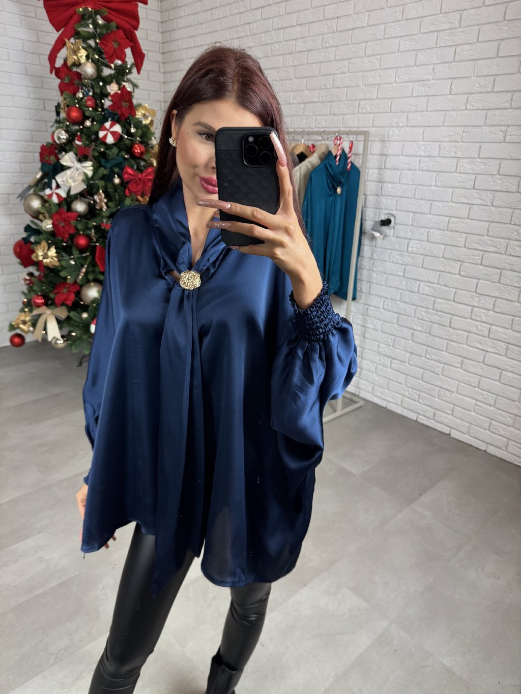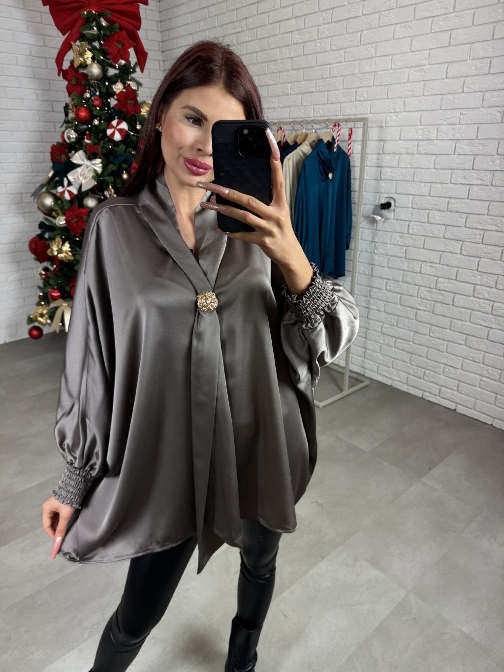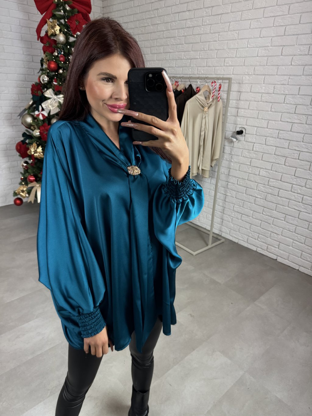 Košile LATORA na první pohled okouzlí nejen padavým a elegantním materiálem, ale i neobvyklým designem. Ozvláštněná je aplikaci připomínající kravatu s odnímatelnou zlatou sponou. Střih je volný, prodloužený, rukávy jsou ukončeny elastickým patentem. Sedne na konfekční velikosti od XS po XL.