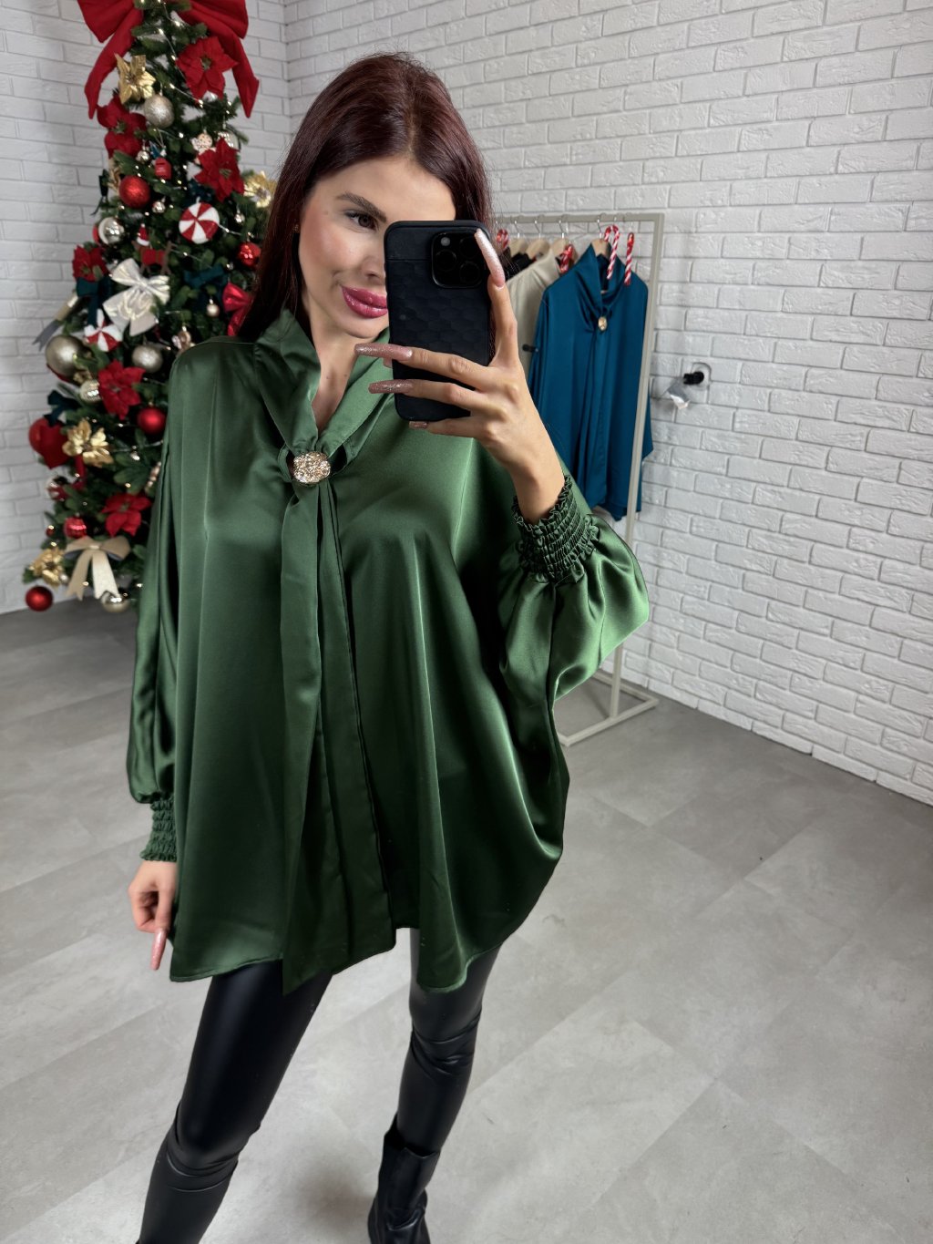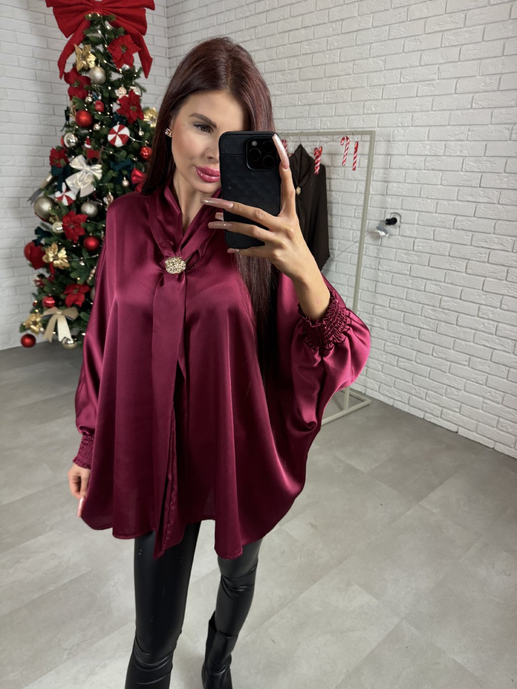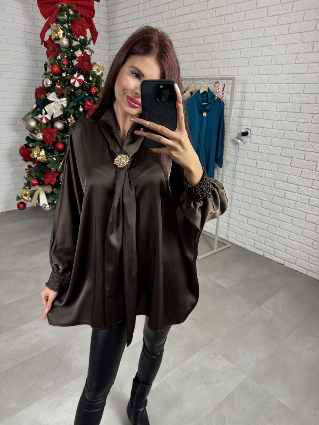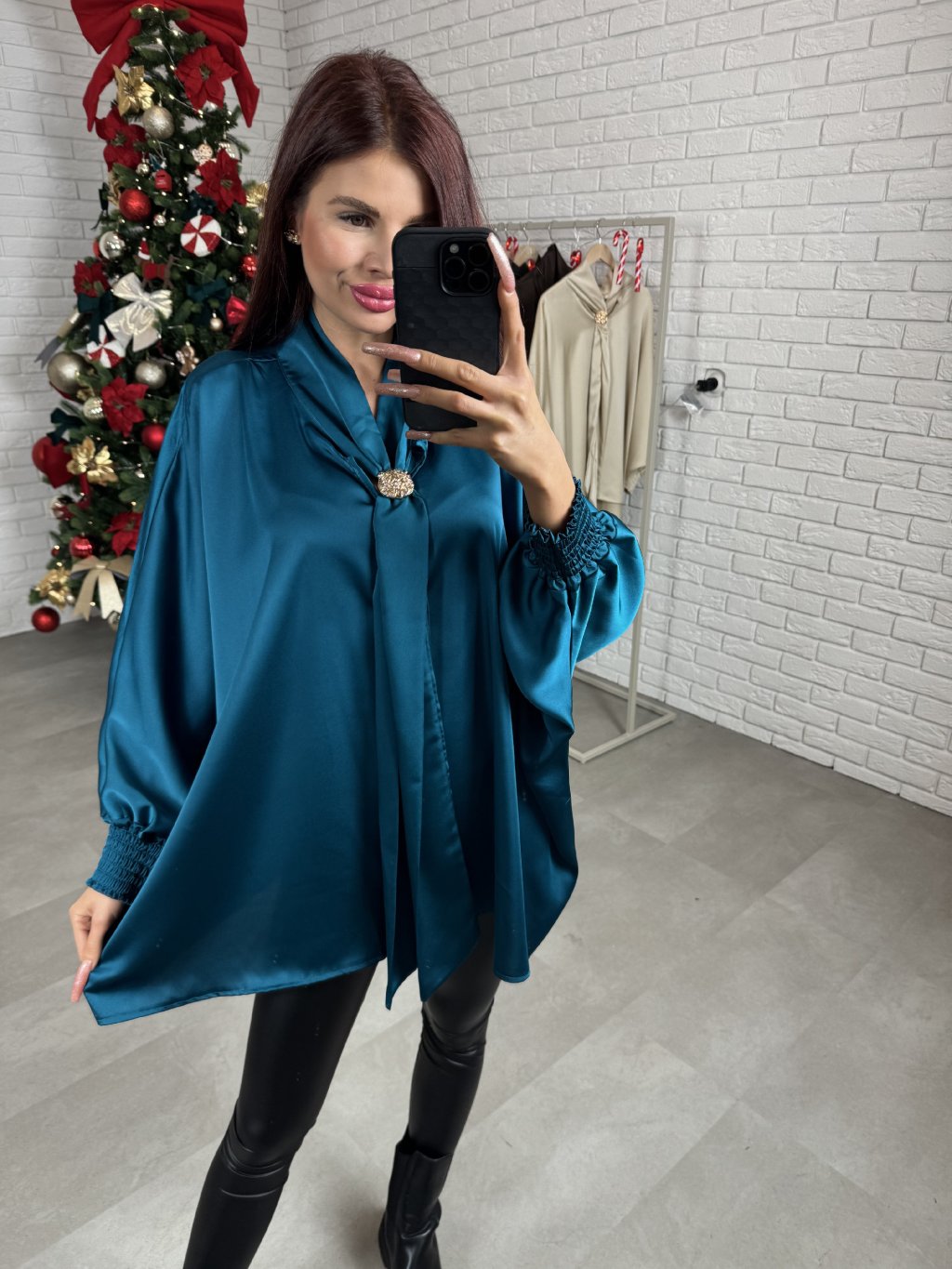 Košile LATORA na první pohled okouzlí nejen padavým a elegantním materiálem, ale i neobvyklým designem. Ozvláštněná je aplikaci připomínající kravatu s odnímatelnou zlatou sponou. Střih je volný, prodloužený, rukávy jsou ukončeny elastickým patentem. Sedne na konfekční velikosti od XS po XL.