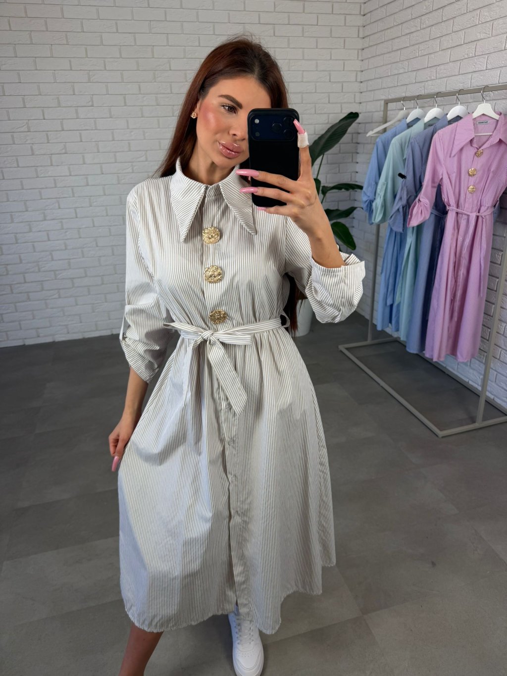 Šaty REMUS sú elegantný košeľový model v midi dĺžke, ktorý pôsobí veľmi žensky a zároveň je mimoriadne pohodlný na nosenie. Voľnejší strih prirodzene splýva na postave a proporčne zakrýva oblasť bokov, pásu, spodného bruška aj zadočku, vďaka čomu vytvára veľmi peknú siluetu.