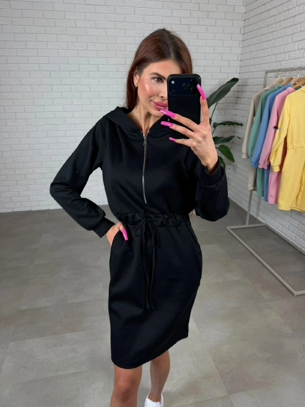 Kapuce dodává šatům sportovně-ležérní charakter a zvyšuje celkový komfort při nošení. Délkou sahají nad kolena a nejkrásněji sednou kočkám do výšky přibližně 175 cm.