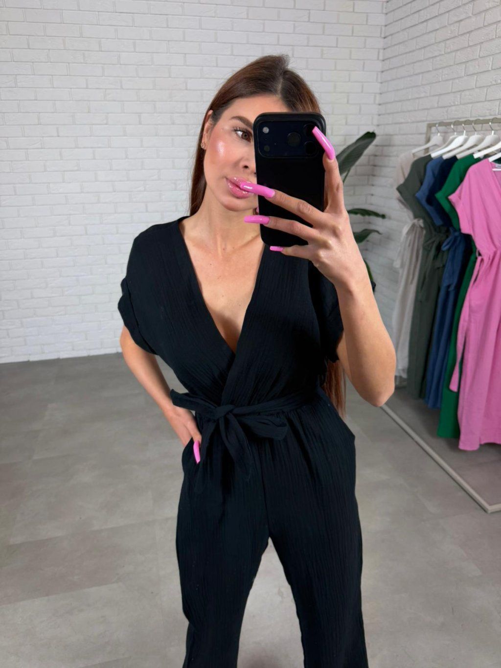 Překládaný dekolt se přizpůsobí různým typům postavy a pěkně zvýrazní horní část siluety. Pod prsy se nachází elastická guma, která jemně zvýrazní pas a zároveň poskytne dostatek komfortu bez obepínání. Volnější rukávy zajistí pohodlí pro každou ručičku a rovný střih kalhot přirozeně splývá na postavě. Nechybí ani hluboké kapsy, které oceníš při každodenním nošení. Overal je ideální pro nižší kočky přibližně do 170 cm a velikostně sedne od XS po menší L.