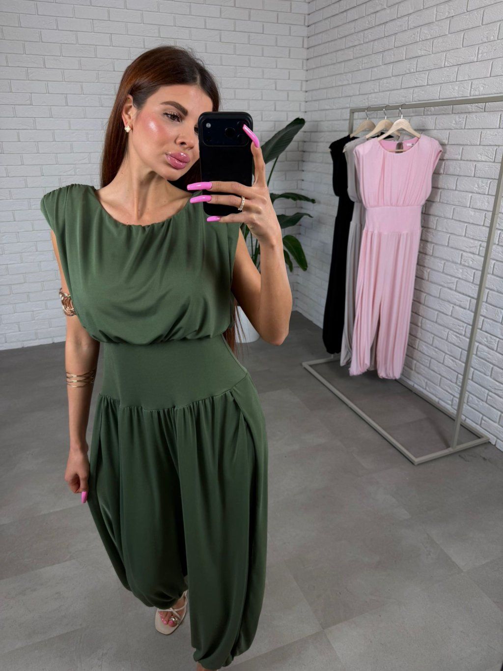 Vrchní část s překládaným a jemně řaseným dekoltem působí žensky a přirozeně zvýrazní horní linii těla. Ramenní vycpávky dodávají postavě pevnější tvar a pomáhají vytvořit vyváženou siluetu, kterou ještě více podtrhne výrazně zúžený pas. Díky tomu overal krásně formuje postavu bez nepříjemného obepínání.