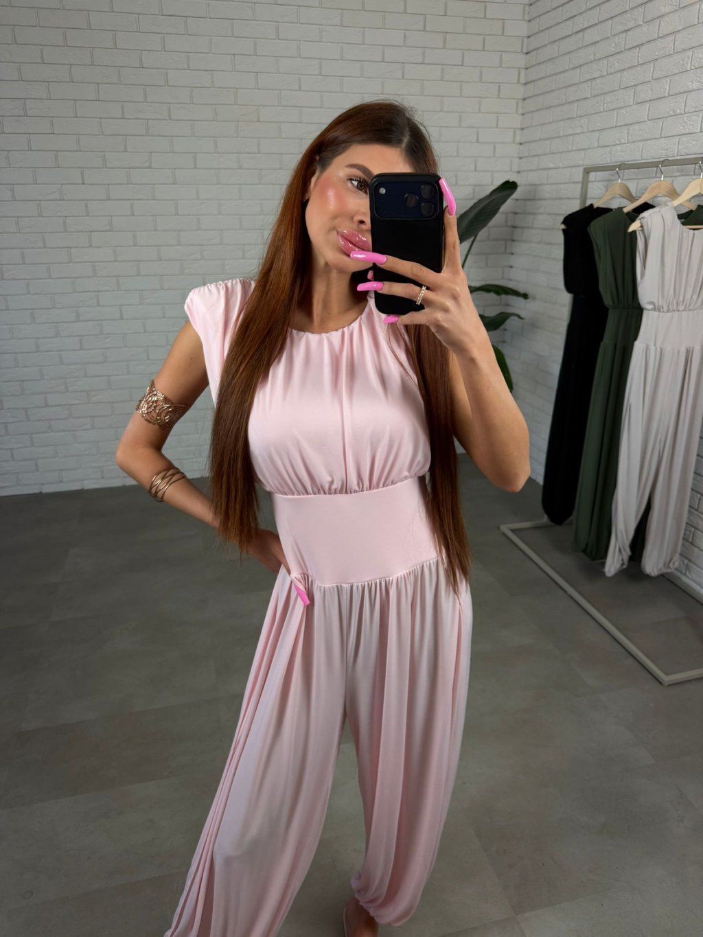 Vrchní část s překládaným a jemně řaseným dekoltem působí žensky a přirozeně zvýrazní horní linii těla. Ramenní vycpávky dodávají postavě pevnější tvar a pomáhají vytvořit vyváženou siluetu, kterou ještě více podtrhne výrazně zúžený pas. Díky tomu overal krásně formuje postavu bez nepříjemného obepínání.