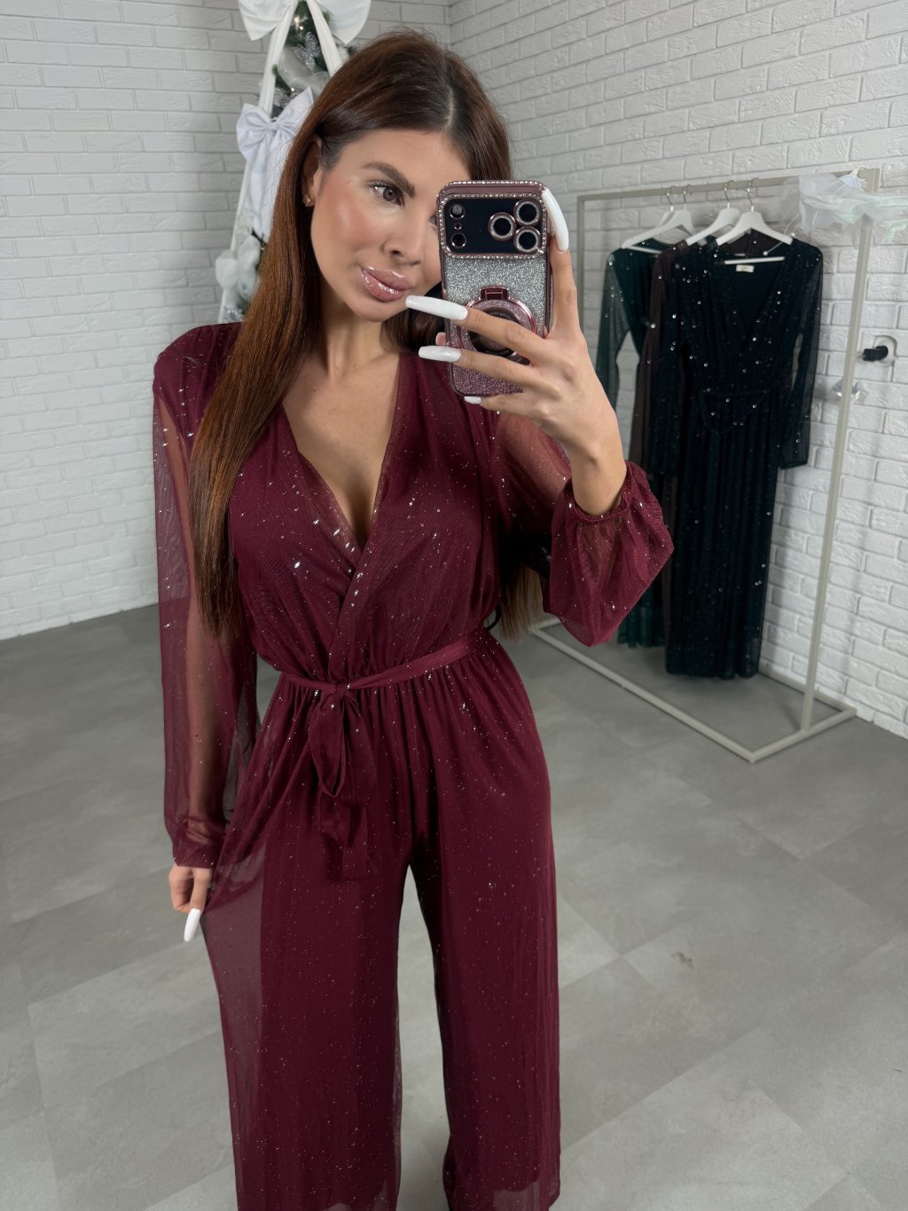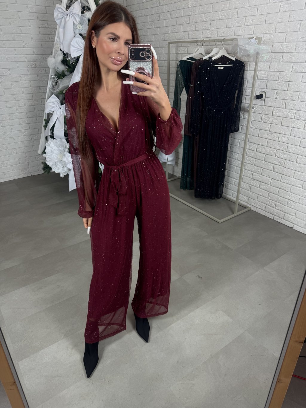 Overal AVARA má volný třpytivý materiál. Sedne i na větší i menší prsa. Vhodný od velikosti XS po L. Regulovatelný pás s vázáním na mašli. Regulovatelný výstřih. Vhodný i pro ženy s většími stehny, které se cítí komfortněji v kalhotách. Vhodný pro postavy do 170 cm. Průsvitné, třpytivé rukávy nádherně dotvářejí celkový dojem z overalu ✨ Ideální pro vás, pokud milujete eleganci a jemný lesk 💖