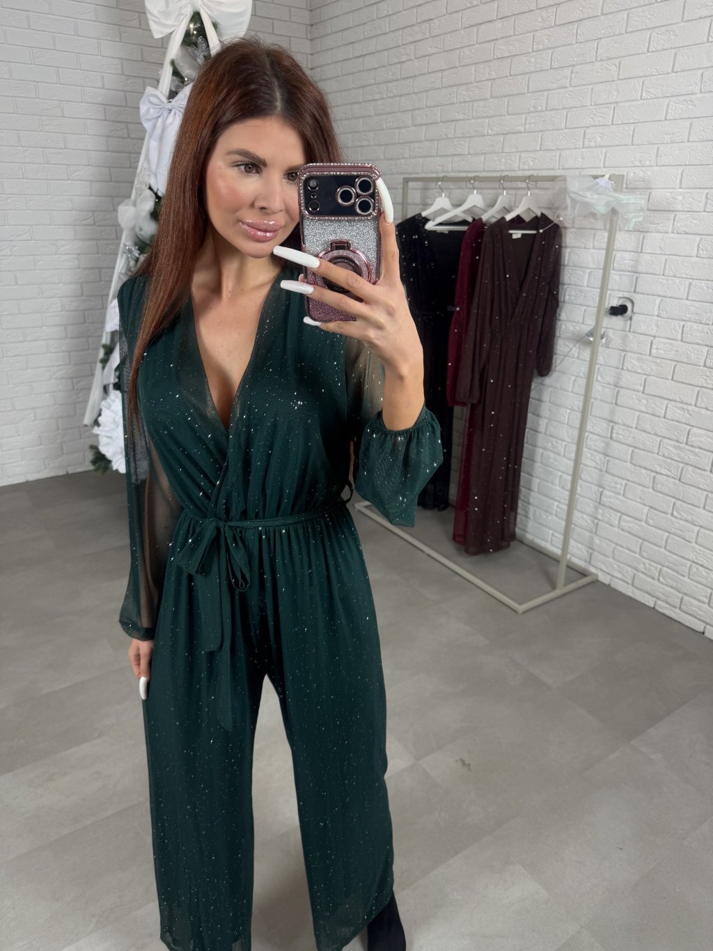 Overal AVARA má volný třpytivý materiál. Sedne i na větší i menší prsa. Vhodný od velikosti XS po L. Regulovatelný pás s vázáním na mašli. Regulovatelný výstřih. Vhodný i pro ženy s většími stehny, které se cítí komfortněji v kalhotách. Vhodný pro postavy do 170 cm. Průsvitné, třpytivé rukávy nádherně dotvářejí celkový dojem z overalu ✨ Ideální pro vás, pokud milujete eleganci a jemný lesk 💖