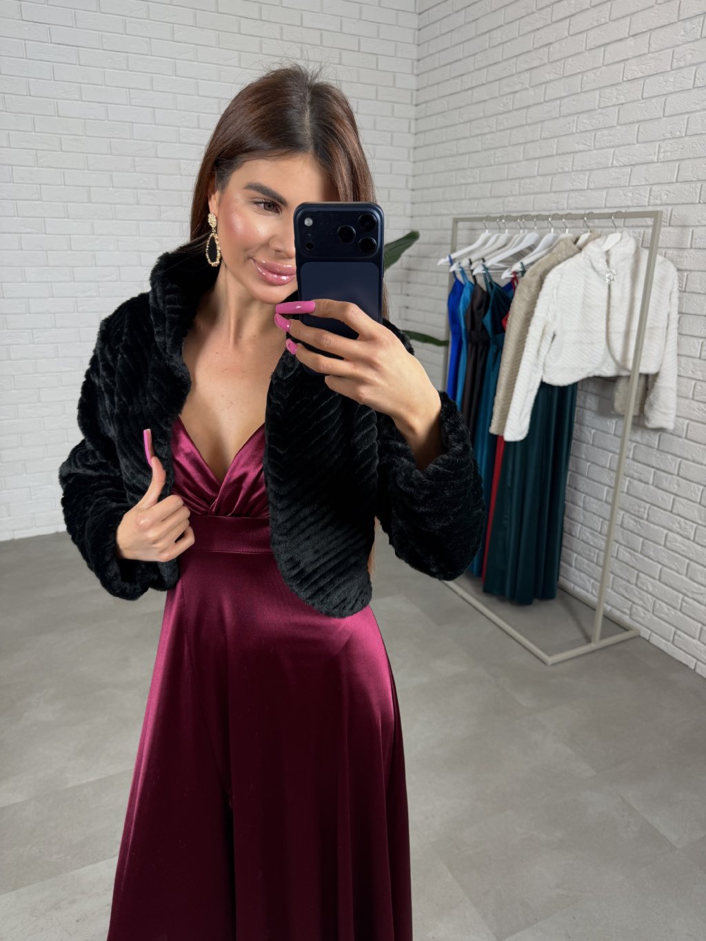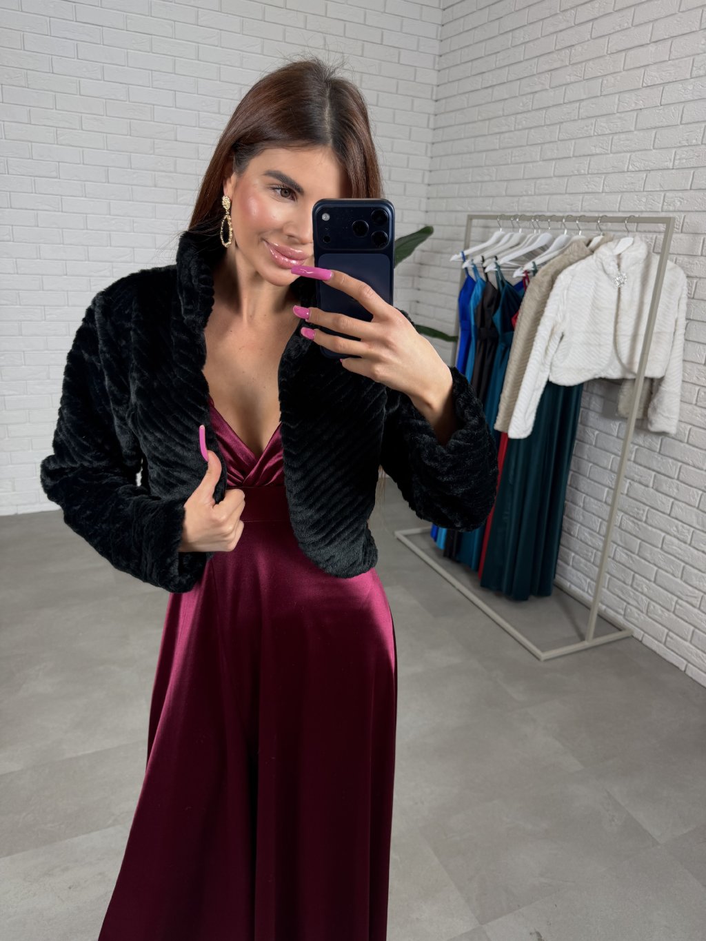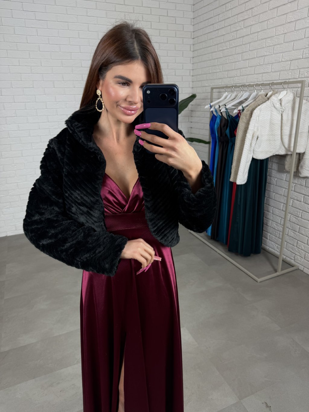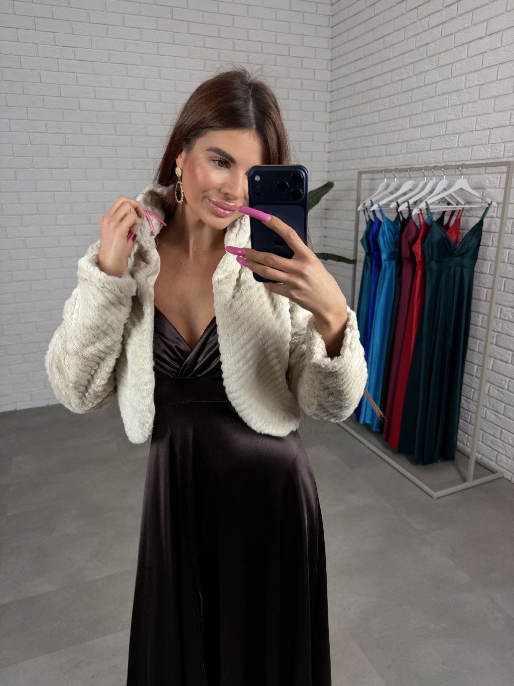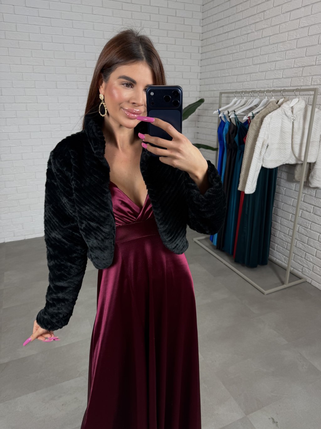 Plesový kožich LORENA je umělý kožich s otevřeným střihem, na fotografii je zkombinován se šaty FLORENTINA. Kožich je strukturovaný a obsahuje brož, která je odepínatelná. Velikostně sedne od XS po L. Je to skvělý kousek na ples.