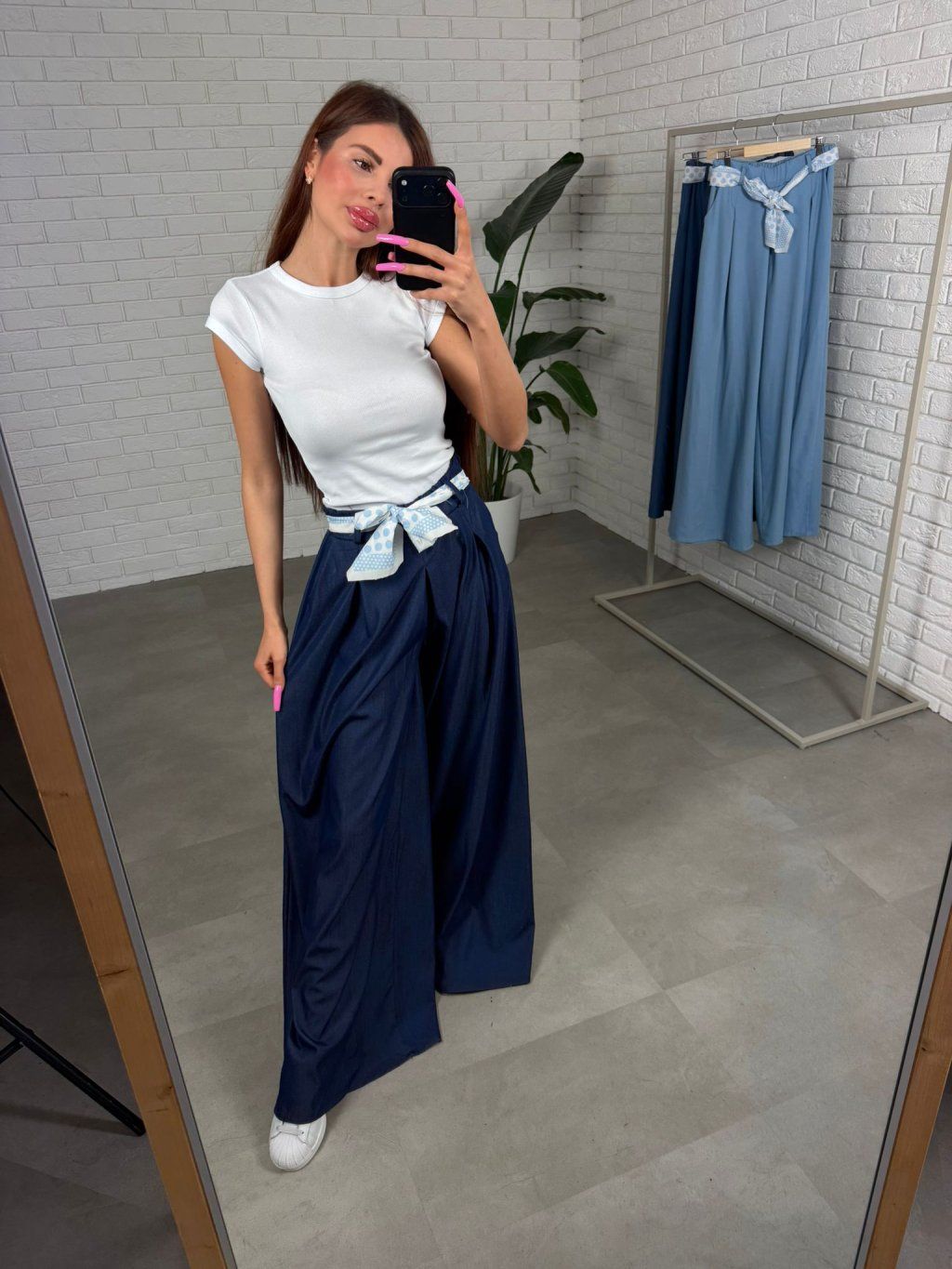 Šátek v pase nahrazuje klasický pásek a dodává kalhotám jemný, ženský detail, který si umíš uvázat podle sebe.