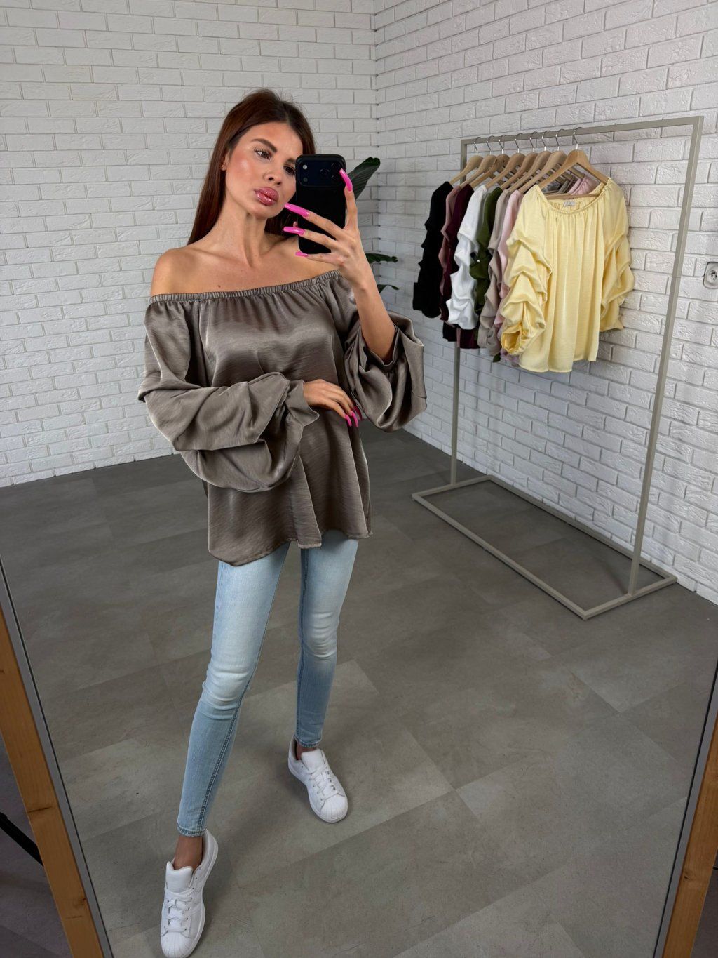Halenka má volný ležérní střih s romantickým volánkem a díky gumičce v horní části ji můžeš nosit klasicky přes ramena nebo spuštěnou pro výraznější ženský efekt. Rukávy jsou zakončeny patentem, takže pěkně drží, nevyhrnují se a působí upraveně. Délka pod hýždě je praktická i při užších kalhotách a podle nálady ji umíš nosit volně spuštěnou nebo zapravenější do pasu pro zvýrazněnou siluetu.