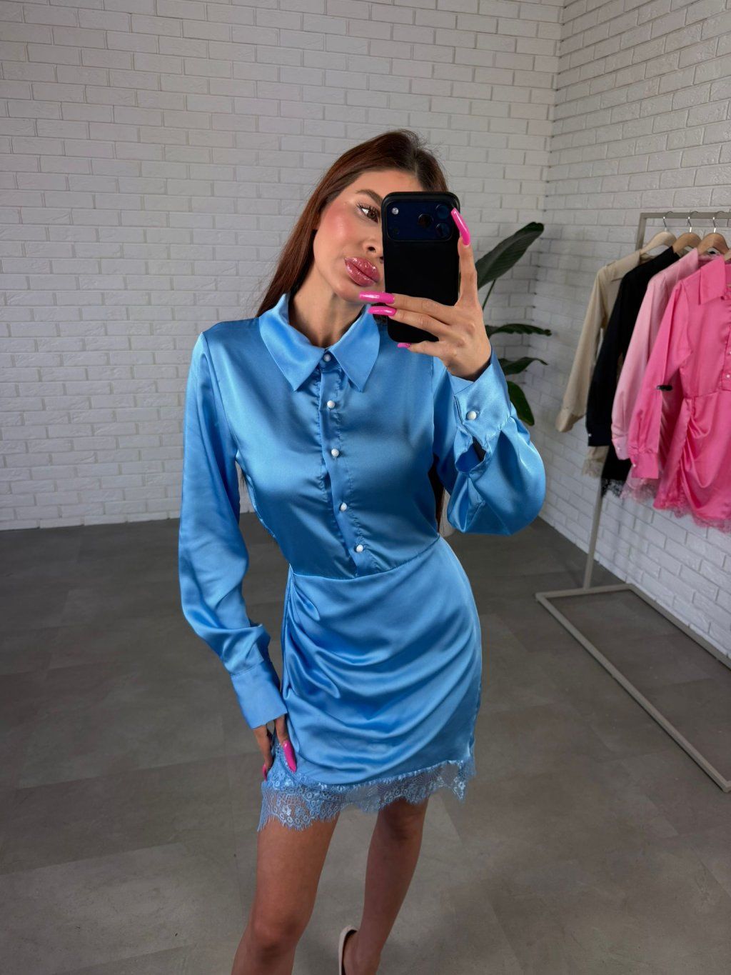 Košilový střih dodává šatům upravený charakter, zatímco mírně nařasená sukně vytváří krásný pohyb při chůzi. Spodní část je doplněna asymetrickou krajkou, která dodává modelu zajímavý a jemně romantický detail.