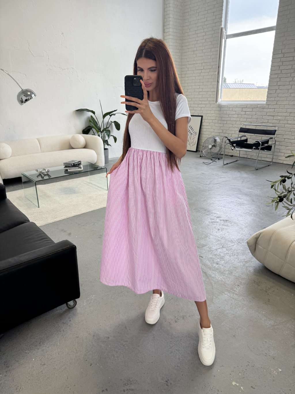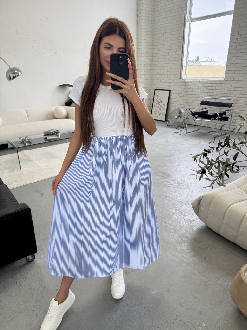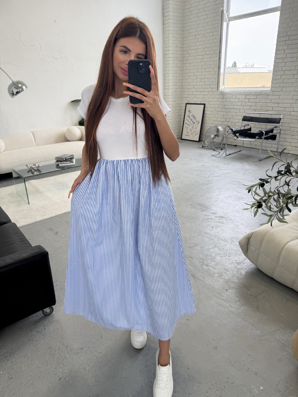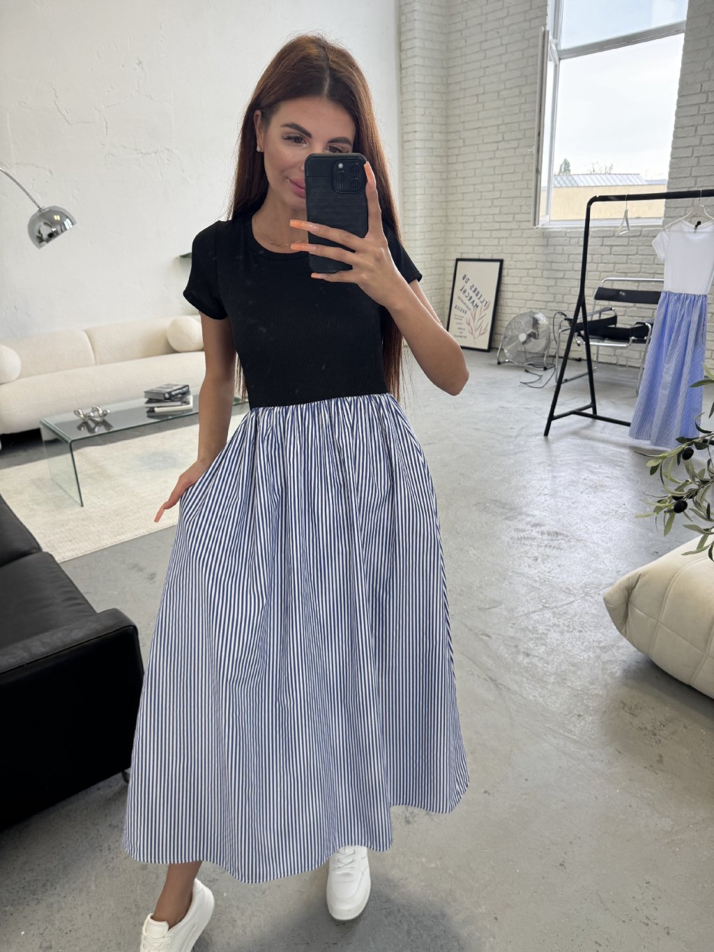 Šaty s krásnou sukní áčkového střihu. Sukýnka je bohatá na materiál, volná a dlouhá. Šaty jsou vhodné i na vyšší holky. Šaty vytvářejí dojem trička a sukně. Sednou od XS po L. V pase elastická gumka. Šaty jsou s krátkým rukávem. V horní části je vroubkovaný materiál. Vhodné pro každou příležitost. Šátečky mají také kapsy.