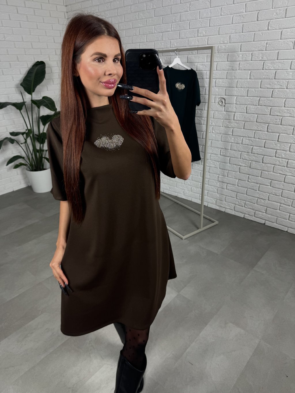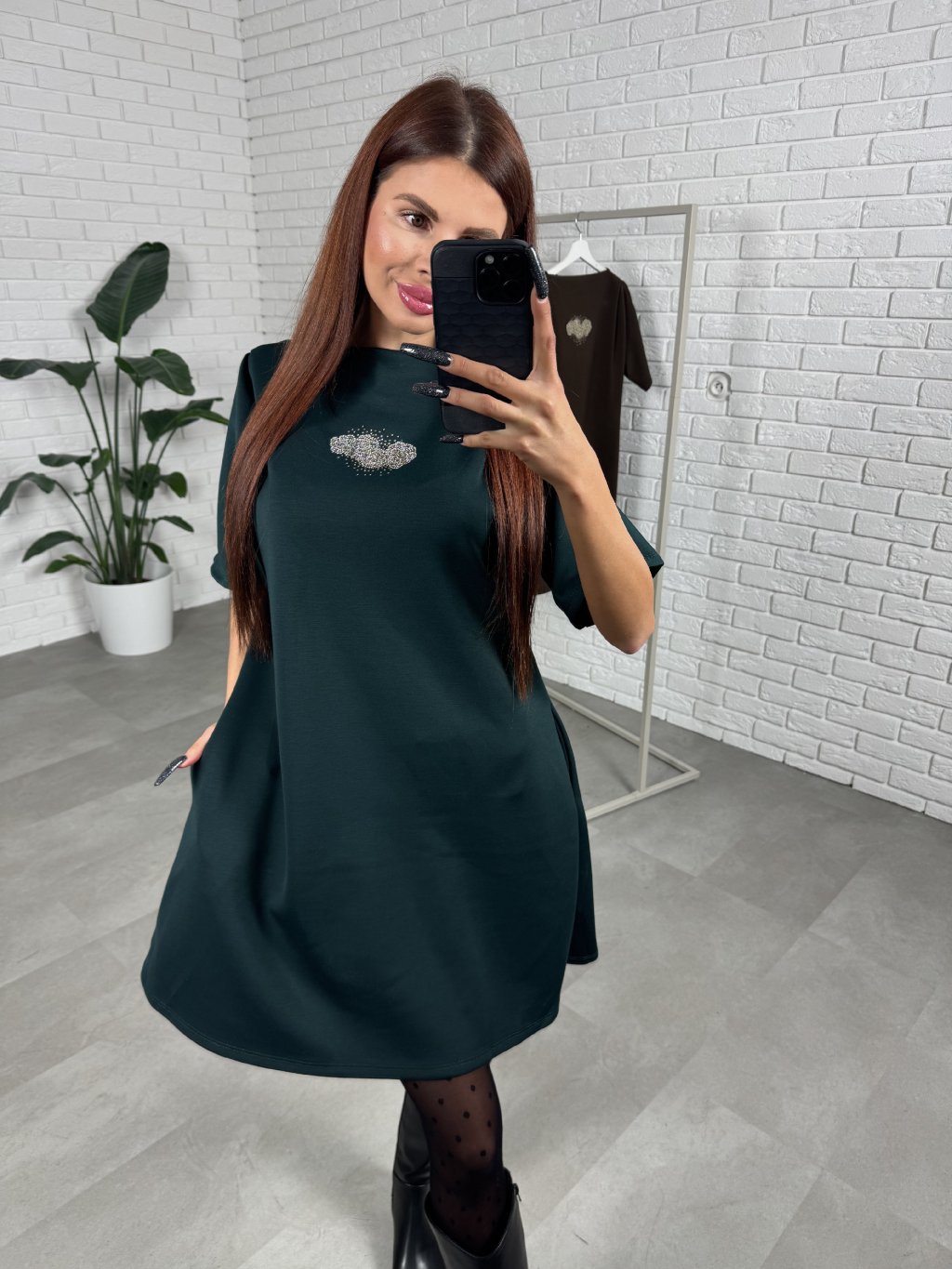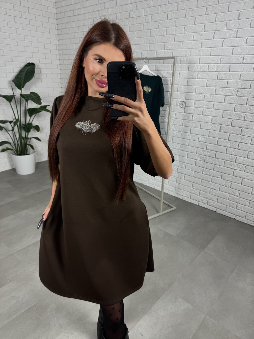 Volný ležérní střih, délka do půlky stehen. Volnější rukáv, který je tříčtvrteční. Šaty ideální pro zakrytí nechtěných nedostatků. Po boku kapsy. Krásná aplikace na šatech.