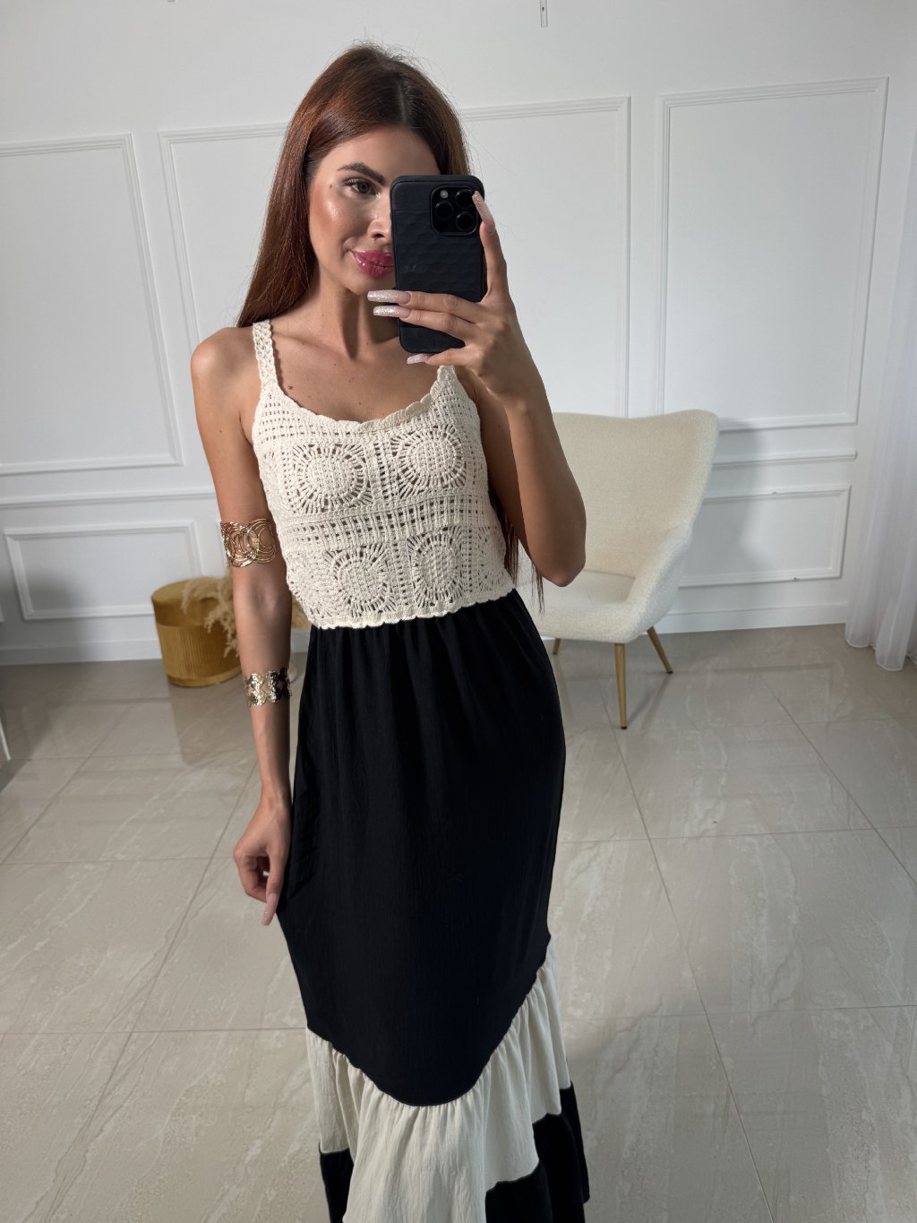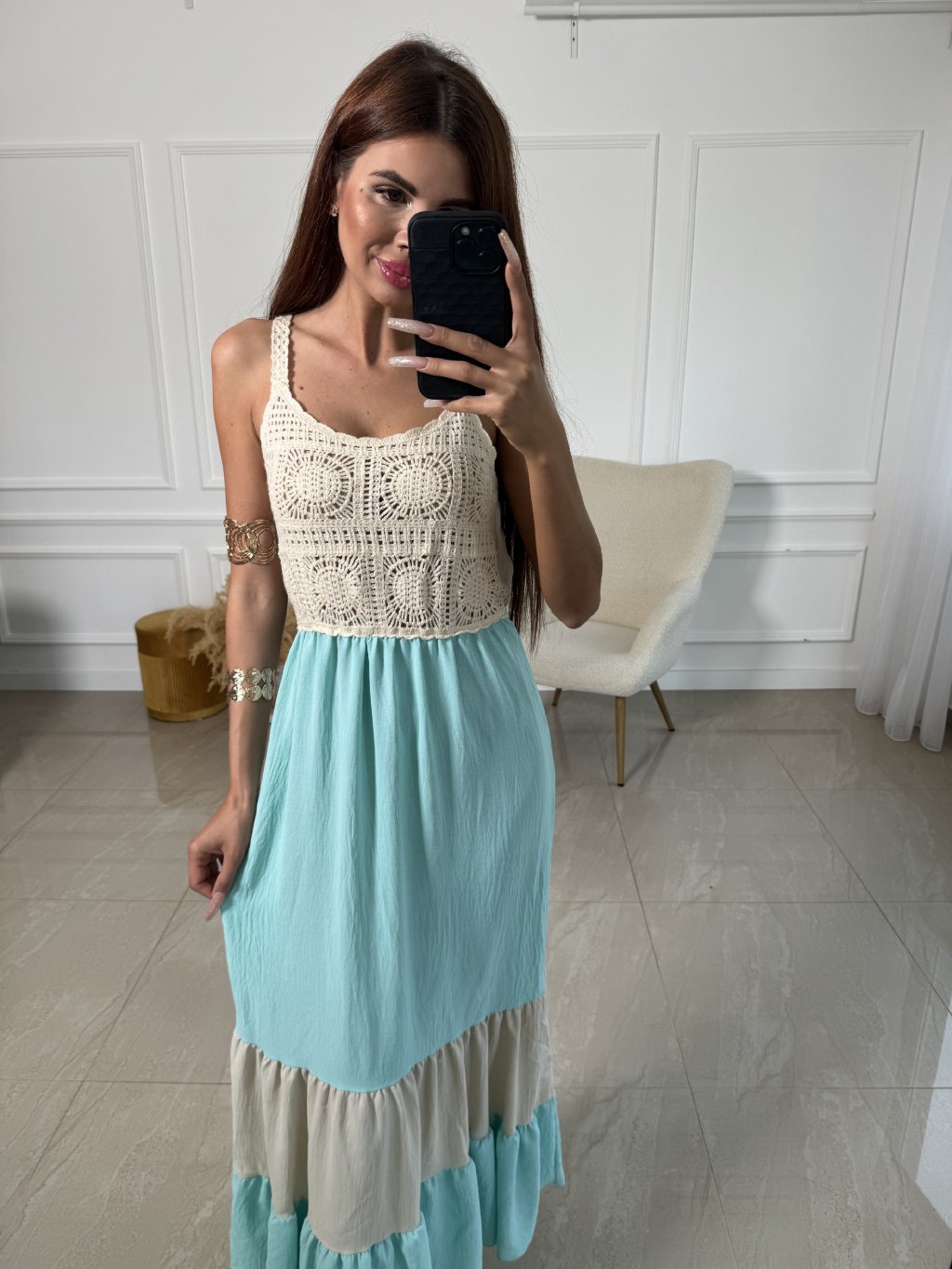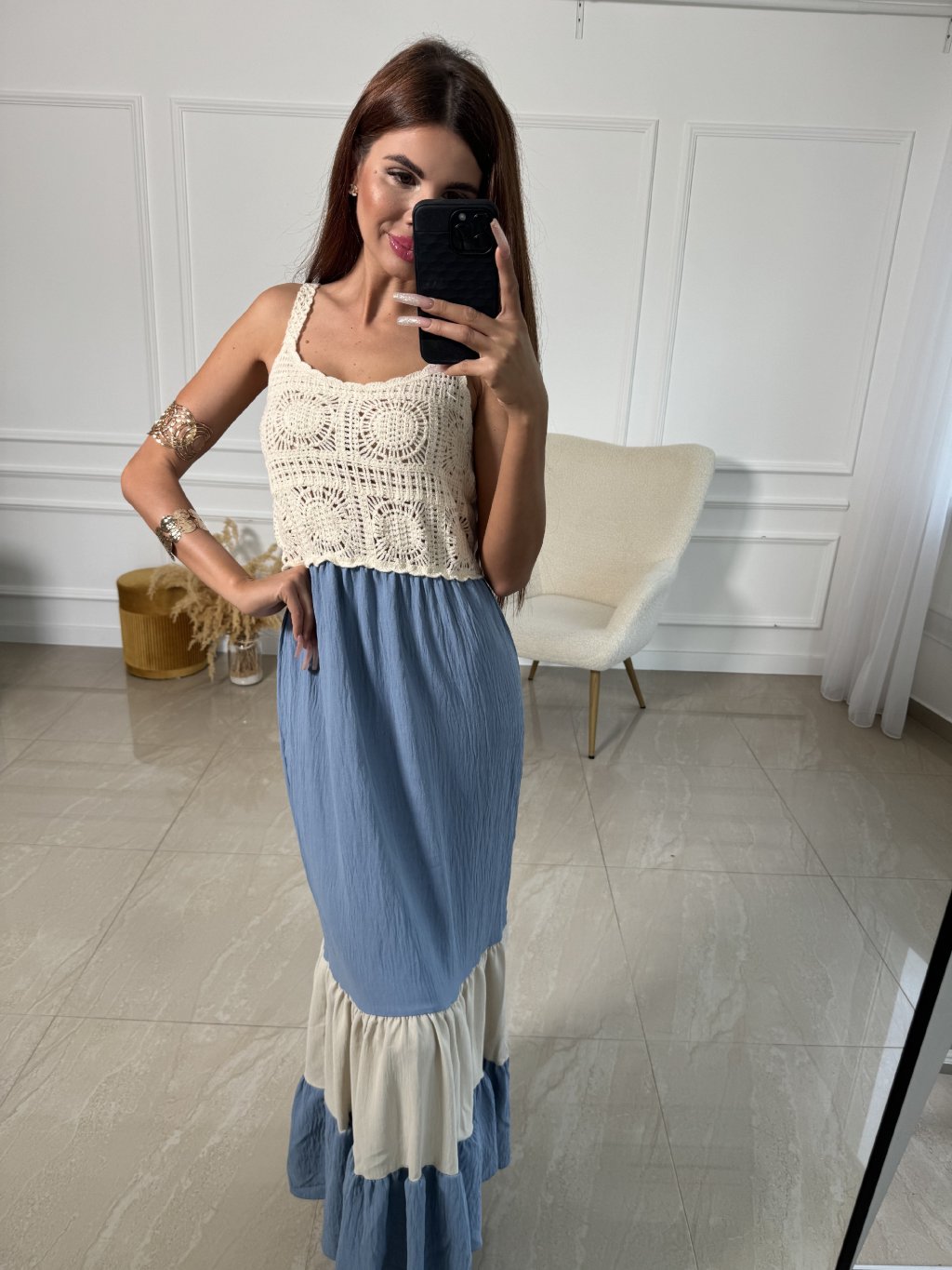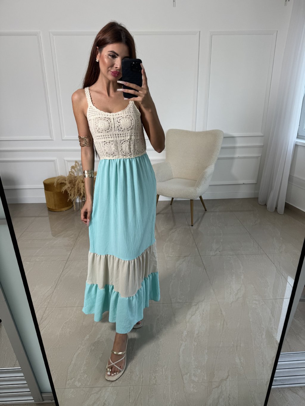 Šaty ARIEL sestávají z měkoučkého háčkovaného topu, který díky své elasticitě sedne na menší i větší prsa. V pase mají elastickou gumku, proto sednou i na těhotenské bříško. Vhodné jsou na velikosti od XS až L. Šaty mají na spodku sukně volánek. Délka šatů sahá po kotníky, proto sednou na nižší i vyšší baby.