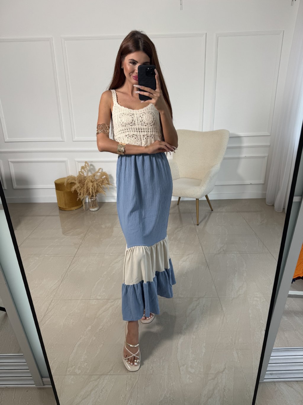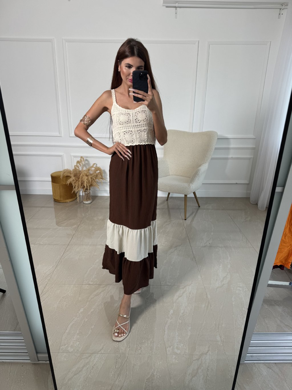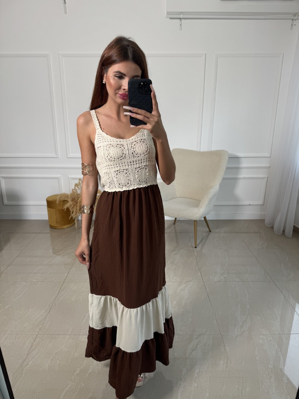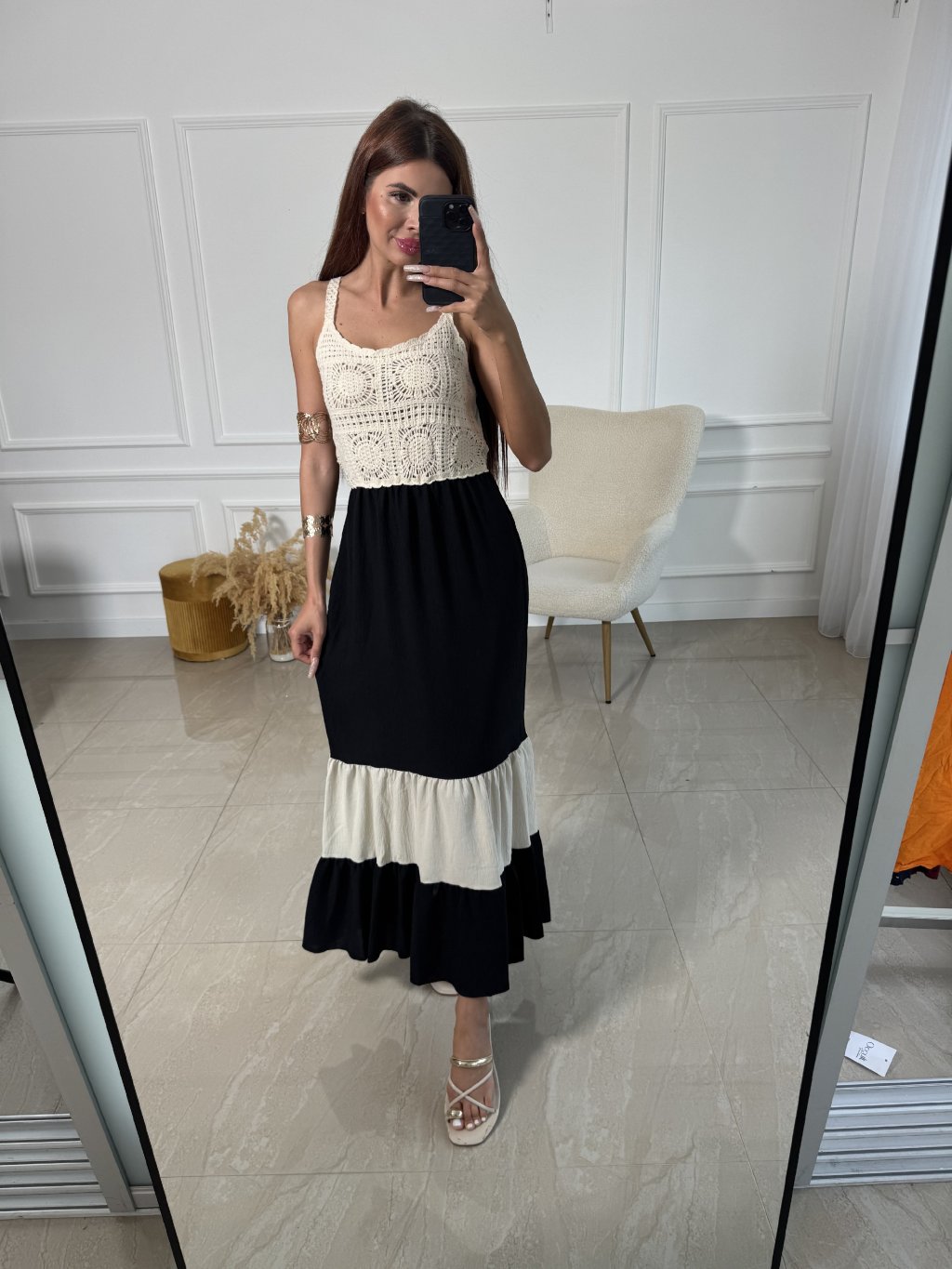 Šaty ARIEL sestávají z měkoučkého háčkovaného topu, který díky své elasticitě sedne na menší i větší prsa. V pase mají elastickou gumku, proto sednou i na těhotenské bříško. Vhodné jsou na velikosti od XS až L. Šaty mají na spodku sukně volánek. Délka šatů sahá po kotníky, proto sednou na nižší i vyšší baby.