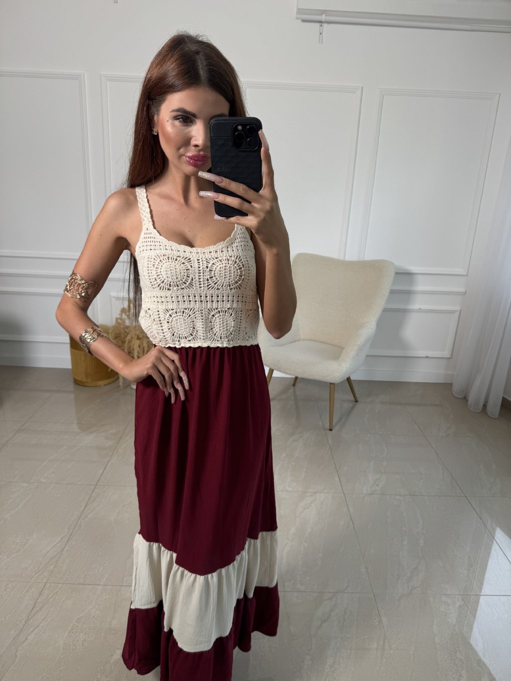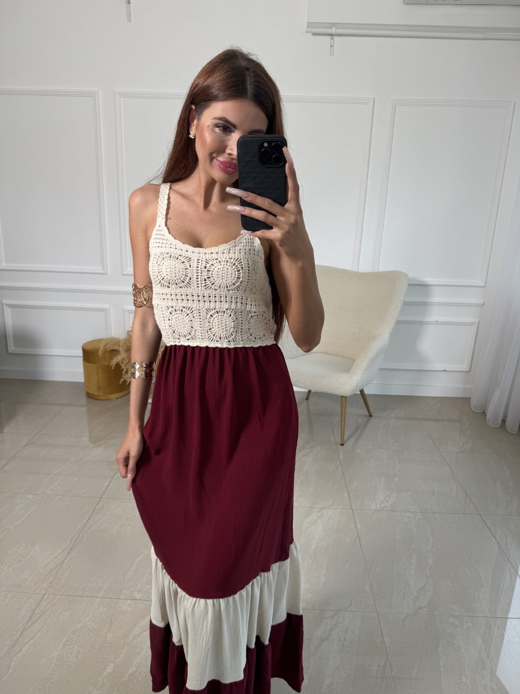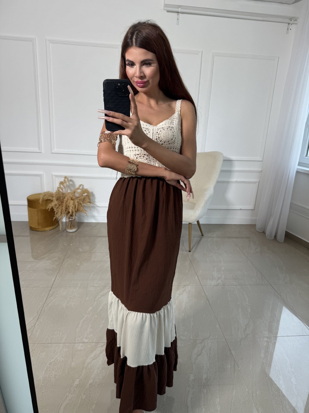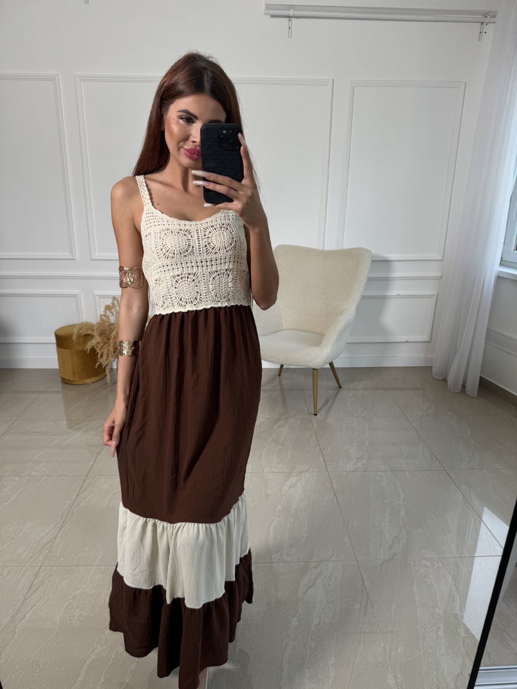 Šaty ARIEL sestávají z měkoučkého háčkovaného topu, který díky své elasticitě sedne na menší i větší prsa. V pase mají elastickou gumku, proto sednou i na těhotenské bříško. Vhodné jsou na velikosti od XS až L. Šaty mají na spodku sukně volánek. Délka šatů sahá po kotníky, proto sednou na nižší i vyšší baby.