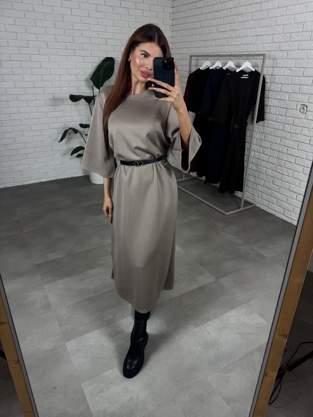 Šaty z poloteplákového materiálu mají tříčtvrteční volný rukáv, jsou volného basic střihu. K šatům je úzká pásek se zlatou přezkou. Délka šatů je nad kotníky. Tento střih je vhodný i pro těhu bříško. Sedne na konfekční velikosti od XS po XL.