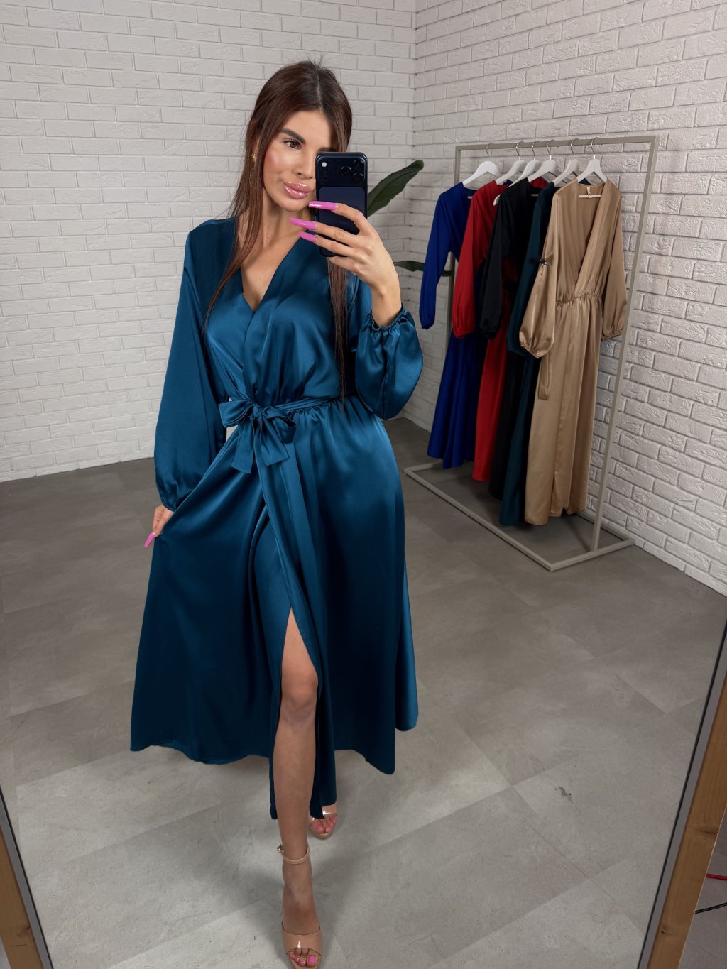 Šaty MARINA jsou vhodné pro konfekční velikosti od XS až po XL, jsou to zavinovací saténové šaty s možností zavázání v pase, mají dlouhý rukáv ukončený patentem, jsou vhodné pro výšku až do 180 cm, vhodné i na těhotenské bříško, modelka na fotce má 170 cm. Ideální na rande i jako plesové šaty.