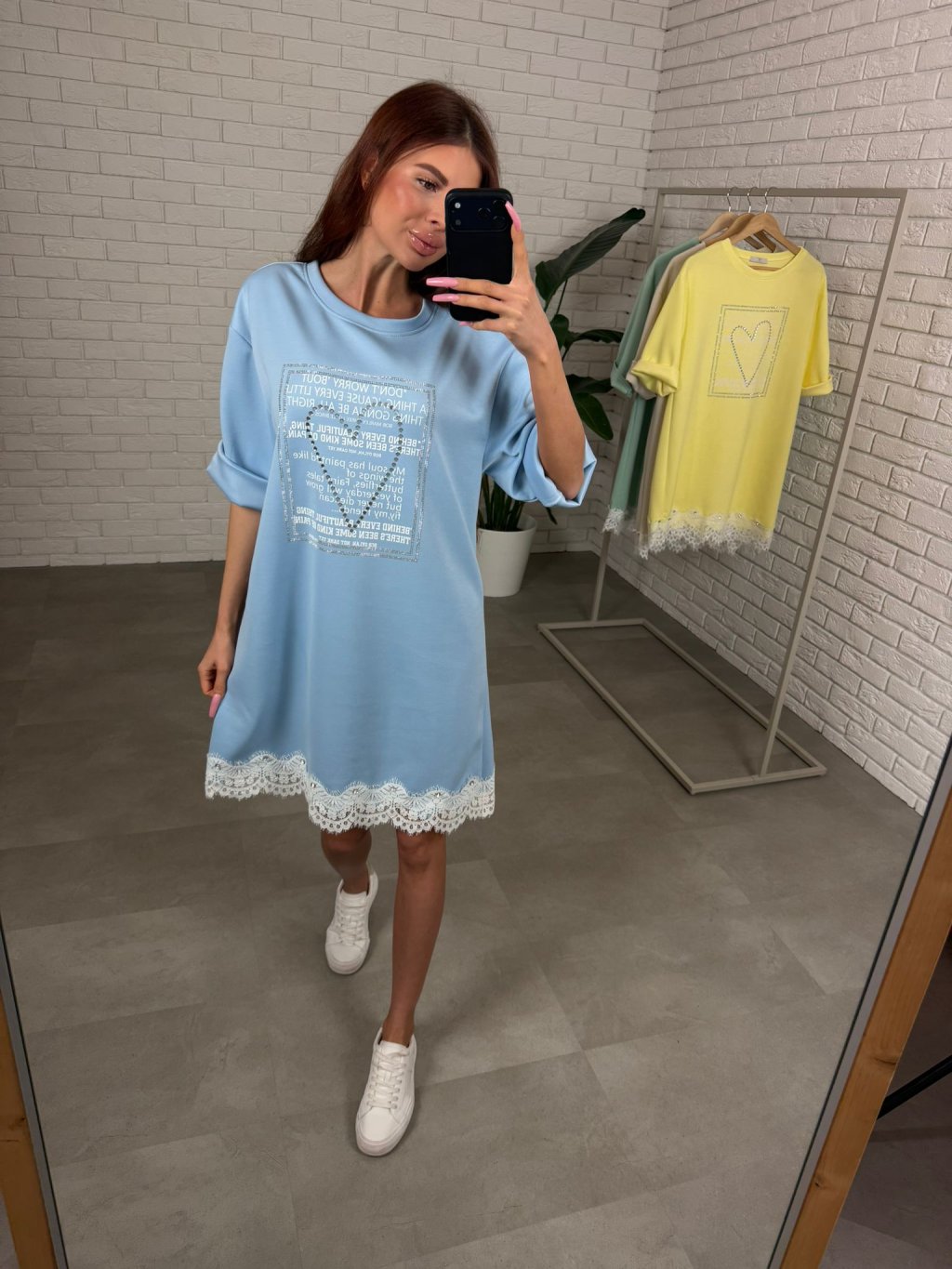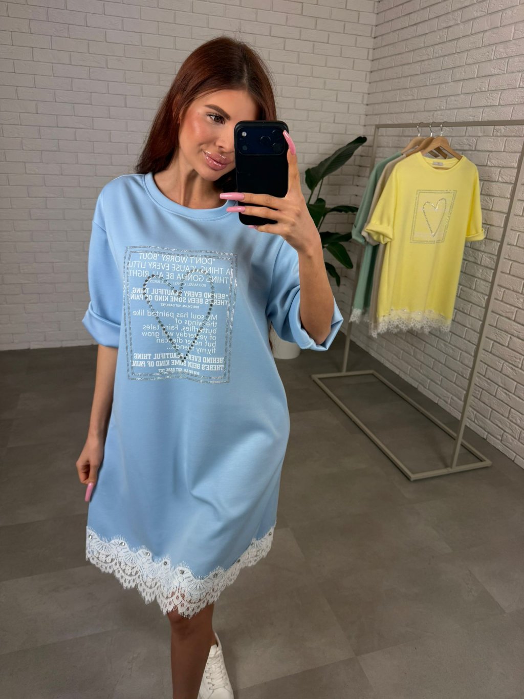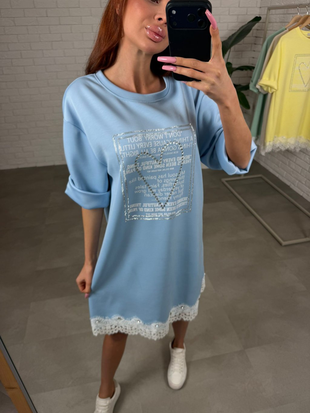 Šaty jsou jako stvořené na dny, kdy chceš pohodlí, ale zároveň nechceš působit obyčejně. Ušity jsou z příjemného poloteplákového materiálu, který se pěkně nosí a zůstává upraven během celého dne. Volnější střih je skvělý pro zakrytí bříška, pasu i boků, takže se v nich budeš cítit komfortně iv období po porodu nebo při těhotenském bříšku. Vpředu zaujmou štrasovým srdíčkem a ozdobným potiskem, díky čemuž působí žensky a jemně rozzáří celý outfit. Rukávy jsou délkou po loket a spodní okraj je ukončen krajkou s drobnými kamínky, což činí z šatů krásný, něžný kousek na běžný den. Velikostně sednou od S po XL.