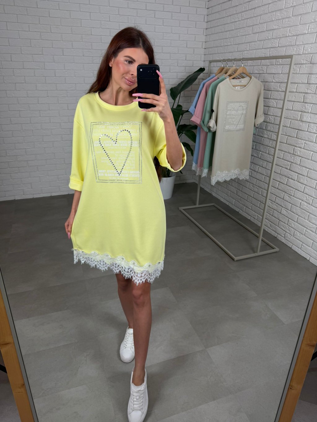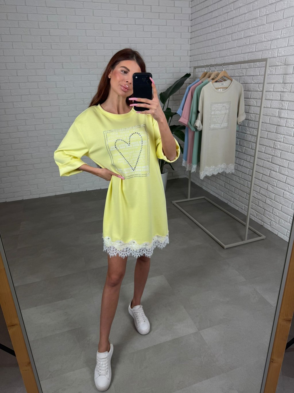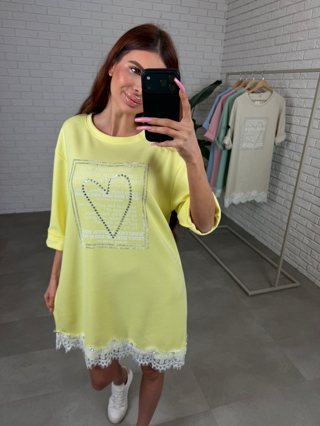 Šaty jsou jako stvořené na dny, kdy chceš pohodlí, ale zároveň nechceš působit obyčejně. Ušity jsou z příjemného poloteplákového materiálu, který se pěkně nosí a zůstává upraven během celého dne. Volnější střih je skvělý pro zakrytí bříška, pasu i boků, takže se v nich budeš cítit komfortně iv období po porodu nebo při těhotenském bříšku. Vpředu zaujmou štrasovým srdíčkem a ozdobným potiskem, díky čemuž působí žensky a jemně rozzáří celý outfit. Rukávy jsou délkou po loket a spodní okraj je ukončen krajkou s drobnými kamínky, což činí z šatů krásný, něžný kousek na běžný den. Velikostně sednou od S po XL.