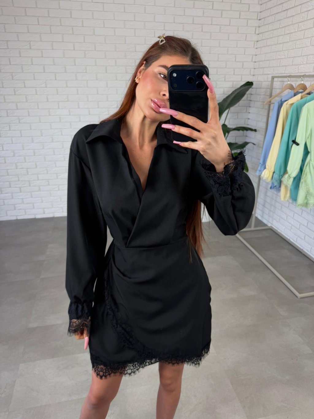 Košilový límeček spolu s krajkovými rukávky dodává modelu elegantní „chic“ nádech. Pás je řešen elastickou gumičkou, která se hezky přizpůsobí postavě, opticky uhladí siluetu a zároveň zůstává velmi pohodlná.