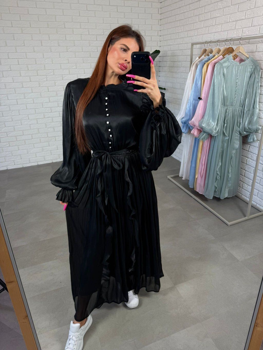 Šaty PLUTO jsou výrazný a elegantní kousek, který působí luxusně a zároveň se velice příjemně nosí. Vrchní část je doplněna ozdobnými knoflíčky a jemně lesklým materiálem, který krásně vynikne při pohybu a dodává šatům výjimečný charakter. Rukávy jsou volné a zakončené elastickou gumičkou, takže se pohodlně přizpůsobí každé ručičce bez pocitu omezení. Bohatá sukýnka vytváří ženský efekt a díky podšívce se šaty nosí komfortně během celého dne.