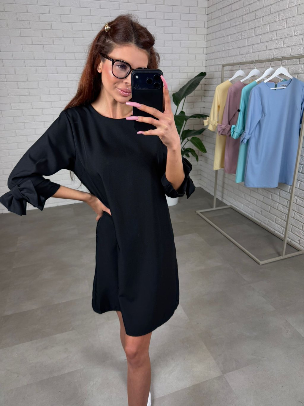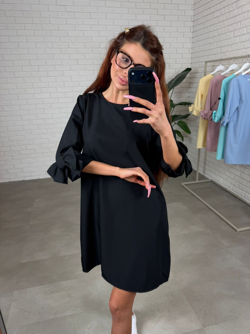 Dominantou modelu jsou tříčtvrteční rukávy zdobené romantickými ozdobnými mašlemi, které dodávají šatům jemný a ženský charakter. Zadní část je doplněna zapínáním na knoflík, což usnadňuje oblékání a zároveň působí elegantně.