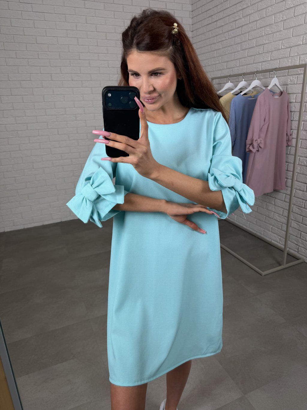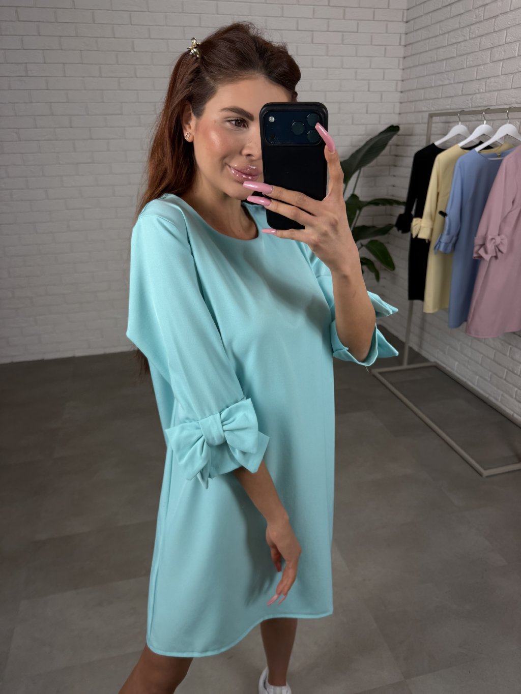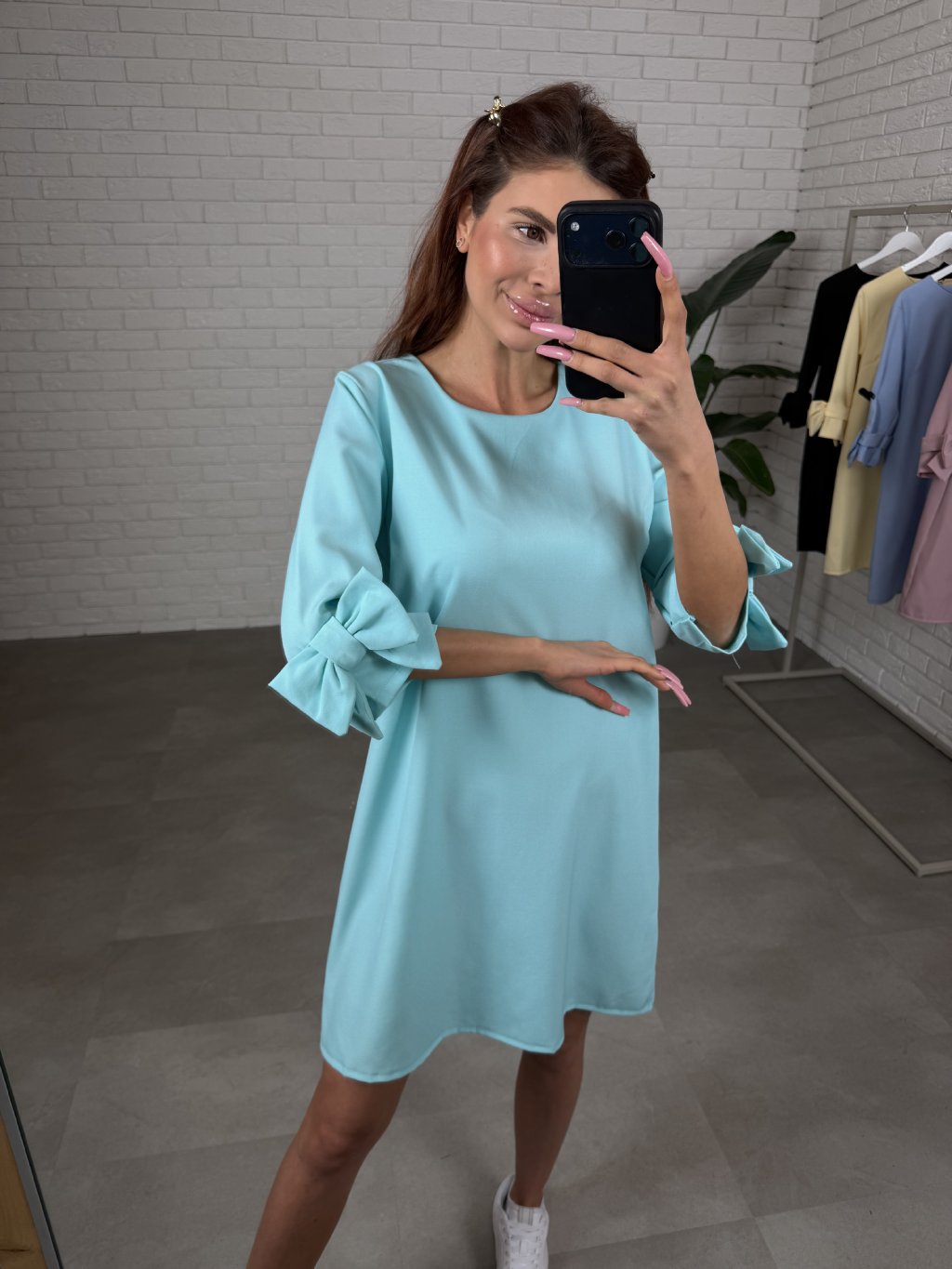 Dominantou modelu jsou tříčtvrteční rukávy zdobené romantickými ozdobnými mašlemi, které dodávají šatům jemný a ženský charakter. Zadní část je doplněna zapínáním na knoflík, což usnadňuje oblékání a zároveň působí elegantně.