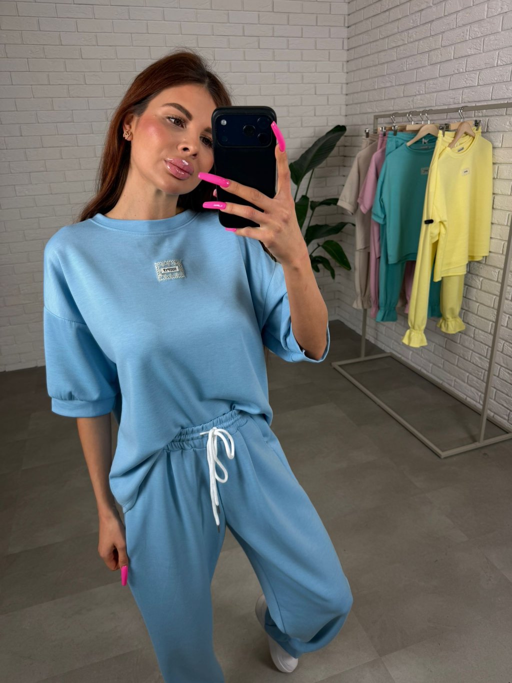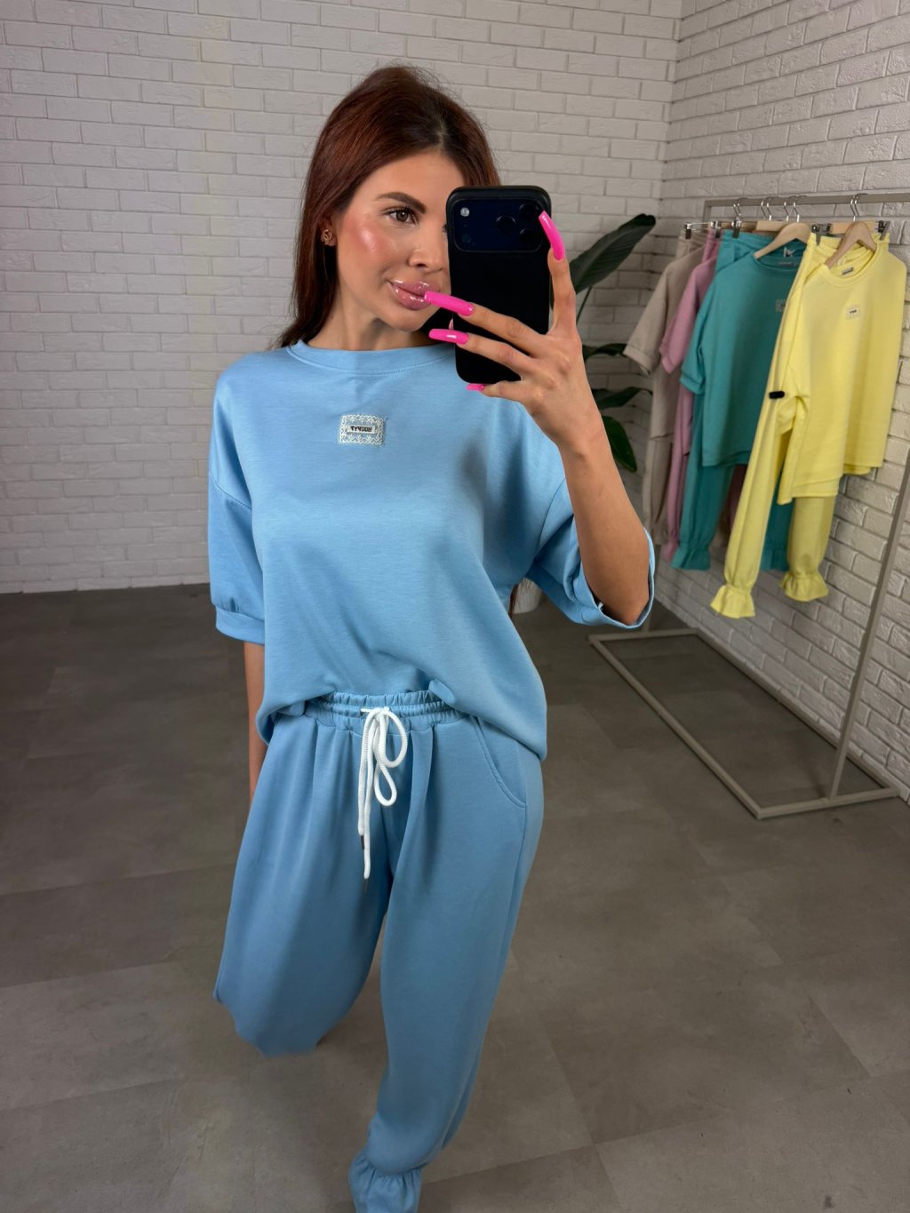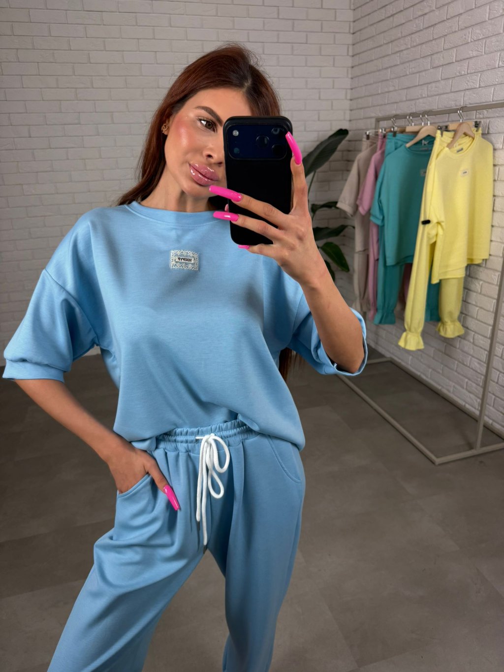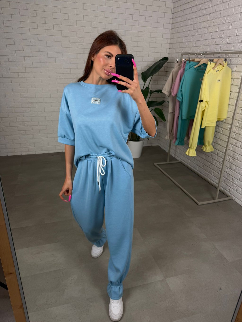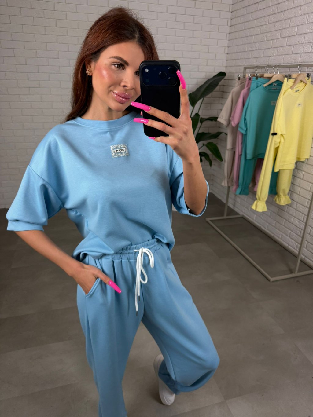 Souprava ELORA je přesně ten typ kousku, který si oblíbíš na každodenní nošení – pohodlná, praktická a stále působí upraveně. Je vyrobená z nejoblíbenějšího poloteplákového materiálu, který je měkký, příjemný na dotek a zároveň si drží hezký tvar během celého dne. Top má krátký rukáv a volný ležérní střih, který sahá až po zadek, takže krásně zakryje, co je potřeba, a zároveň poskytne maximální pohodlí. Rukávy jsou dostatečně volné, takže se přizpůsobí každé ruce bez pocitu omezení. Kalhoty jsou zakončené nápletem, díky čemuž působí upraveně a skvěle se kombinují hlavně s teniskami. Střih je pohodlný a přizpůsobí se i postavám s výraznějšími křivkami v oblasti boků, bříška či zadečku. Souprava ELORA je ideální pro vyšší holky, vhodná na výšku přibližně od 165 do 185 cm a velikostně sedne na M až XL.