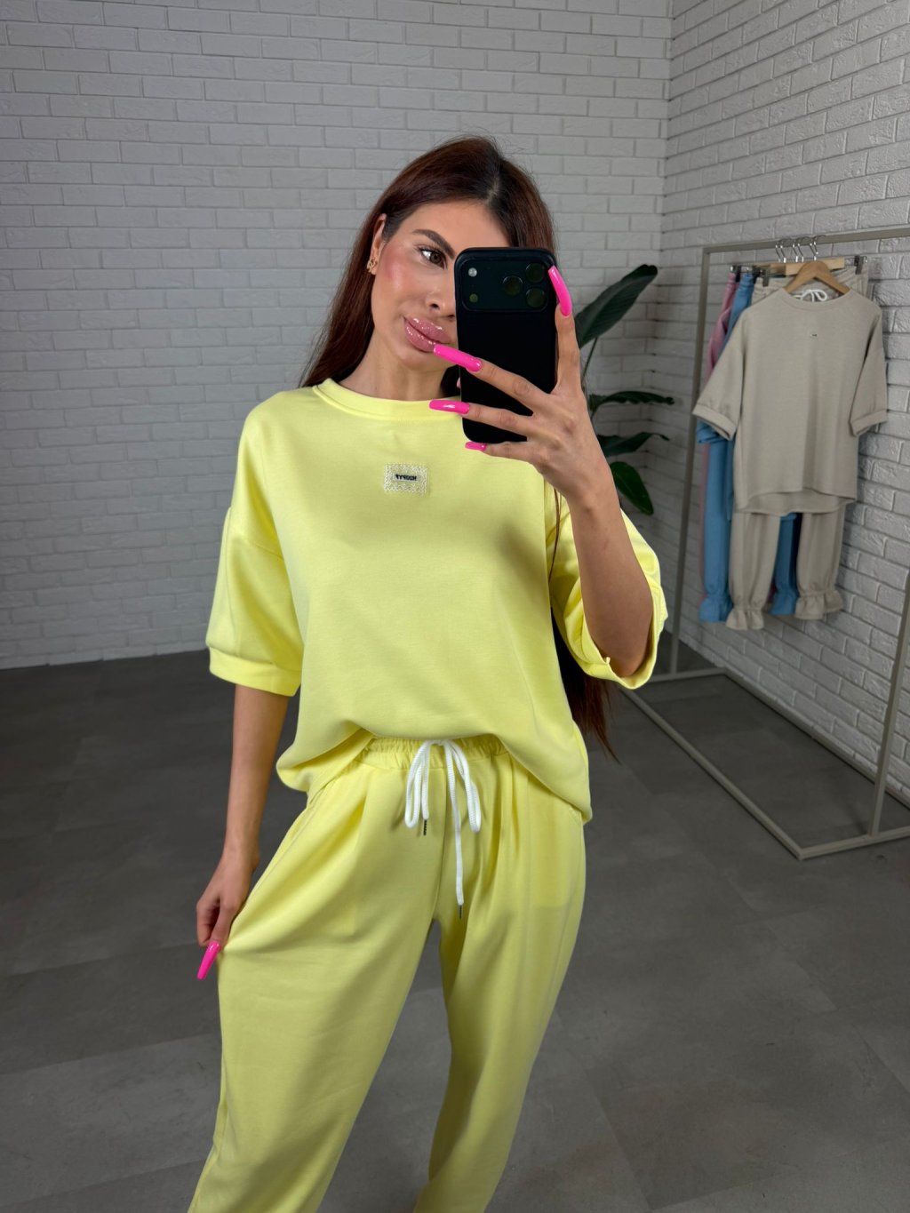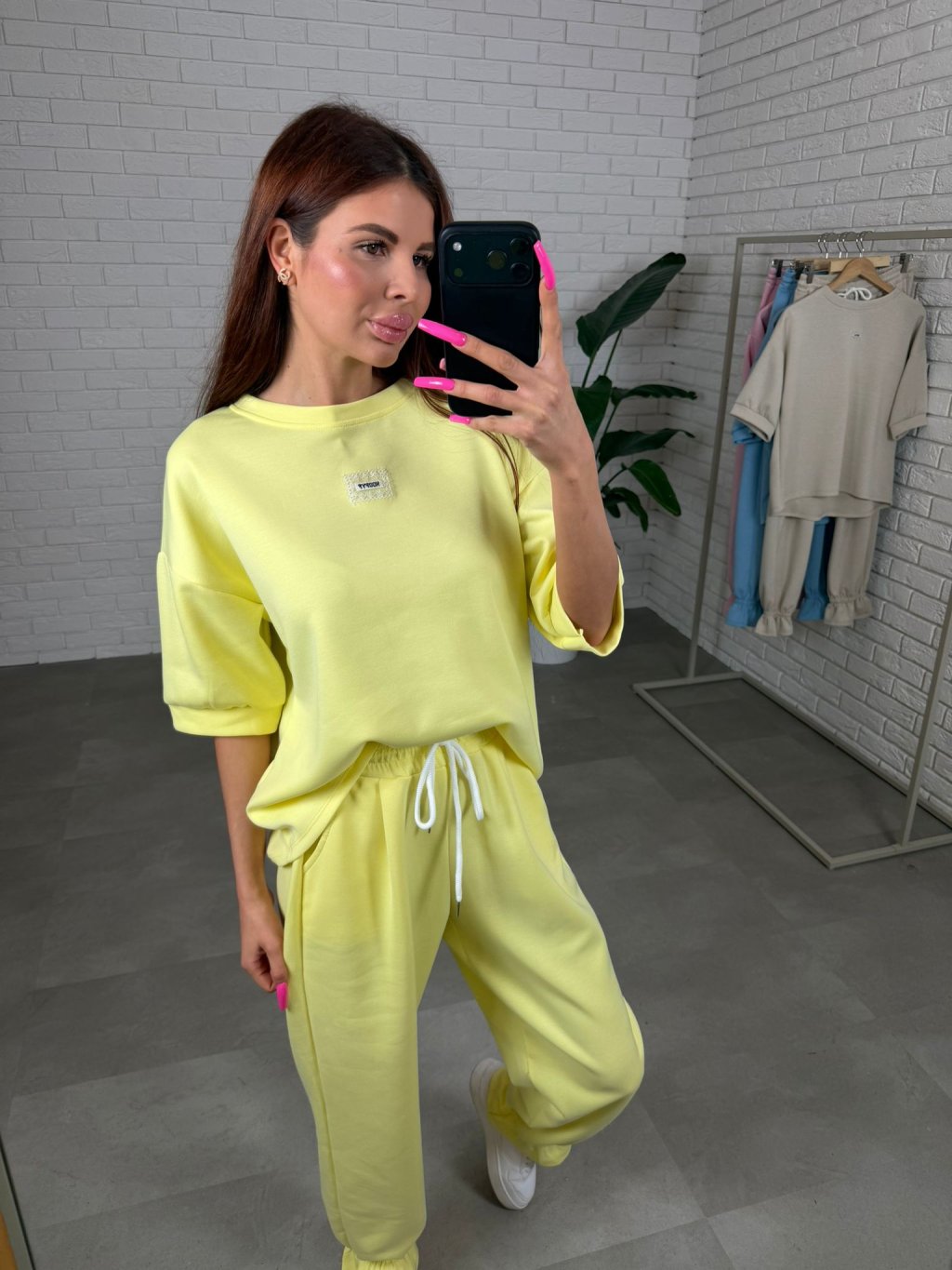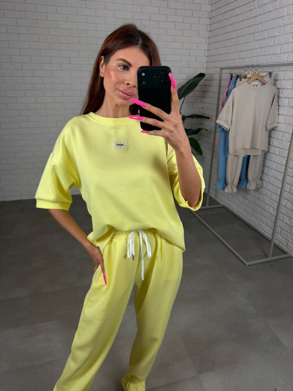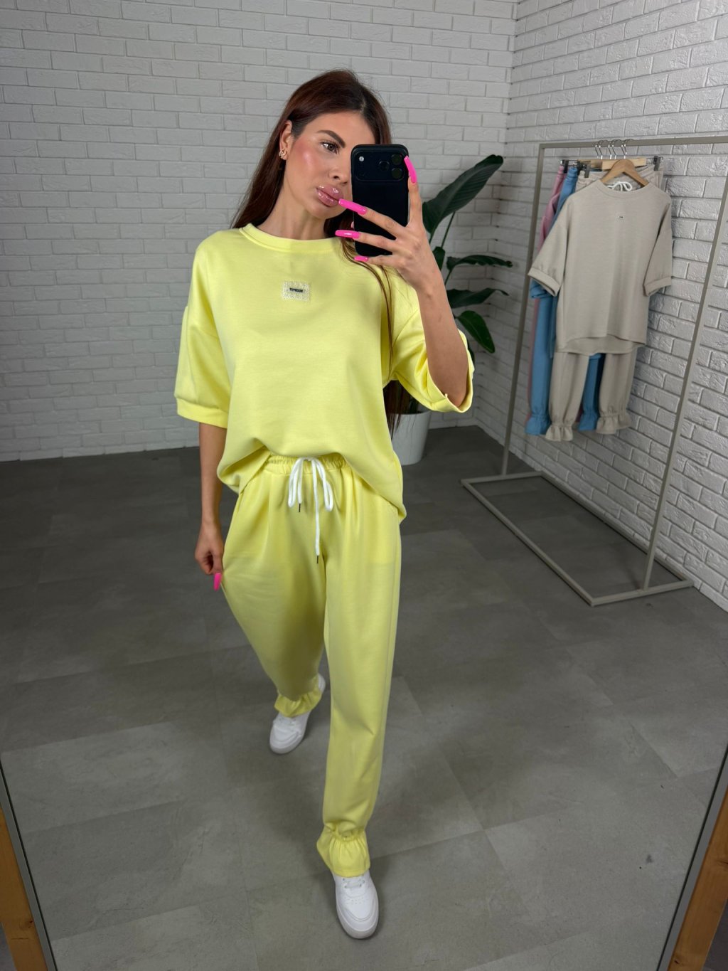 Souprava ELORA je přesně ten typ kousku, který si oblíbíš na každodenní nošení – pohodlná, praktická a stále působí upraveně. Je vyrobená z nejoblíbenějšího poloteplákového materiálu, který je měkký, příjemný na dotek a zároveň si drží hezký tvar během celého dne. Top má krátký rukáv a volný ležérní střih, který sahá až po zadek, takže krásně zakryje, co je potřeba, a zároveň poskytne maximální pohodlí. Rukávy jsou dostatečně volné, takže se přizpůsobí každé ruce bez pocitu omezení. Kalhoty jsou zakončené nápletem, díky čemuž působí upraveně a skvěle se kombinují hlavně s teniskami. Střih je pohodlný a přizpůsobí se i postavám s výraznějšími křivkami v oblasti boků, bříška či zadečku. Souprava ELORA je ideální pro vyšší holky, vhodná na výšku přibližně od 165 do 185 cm a velikostně sedne na M až XL.